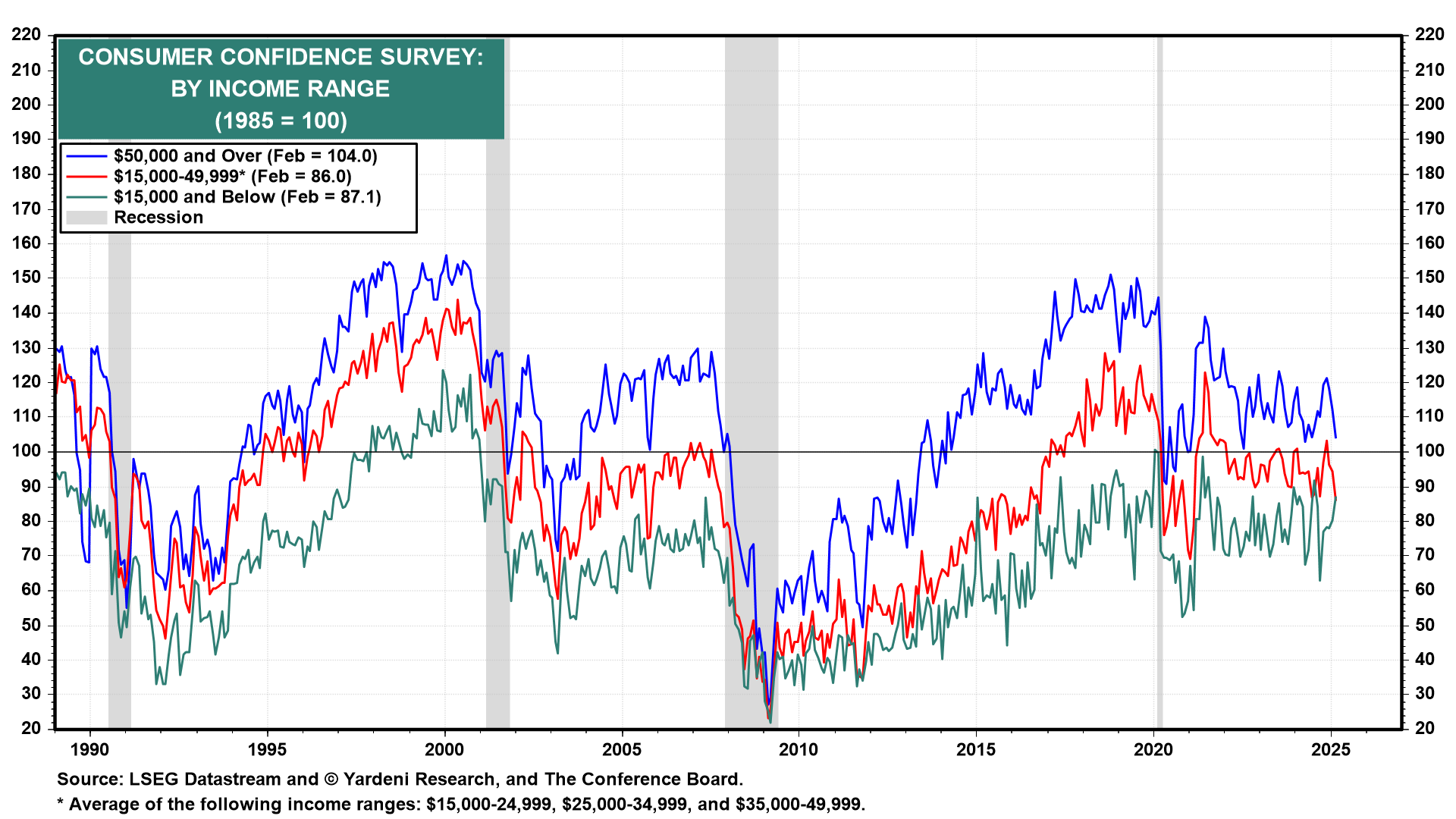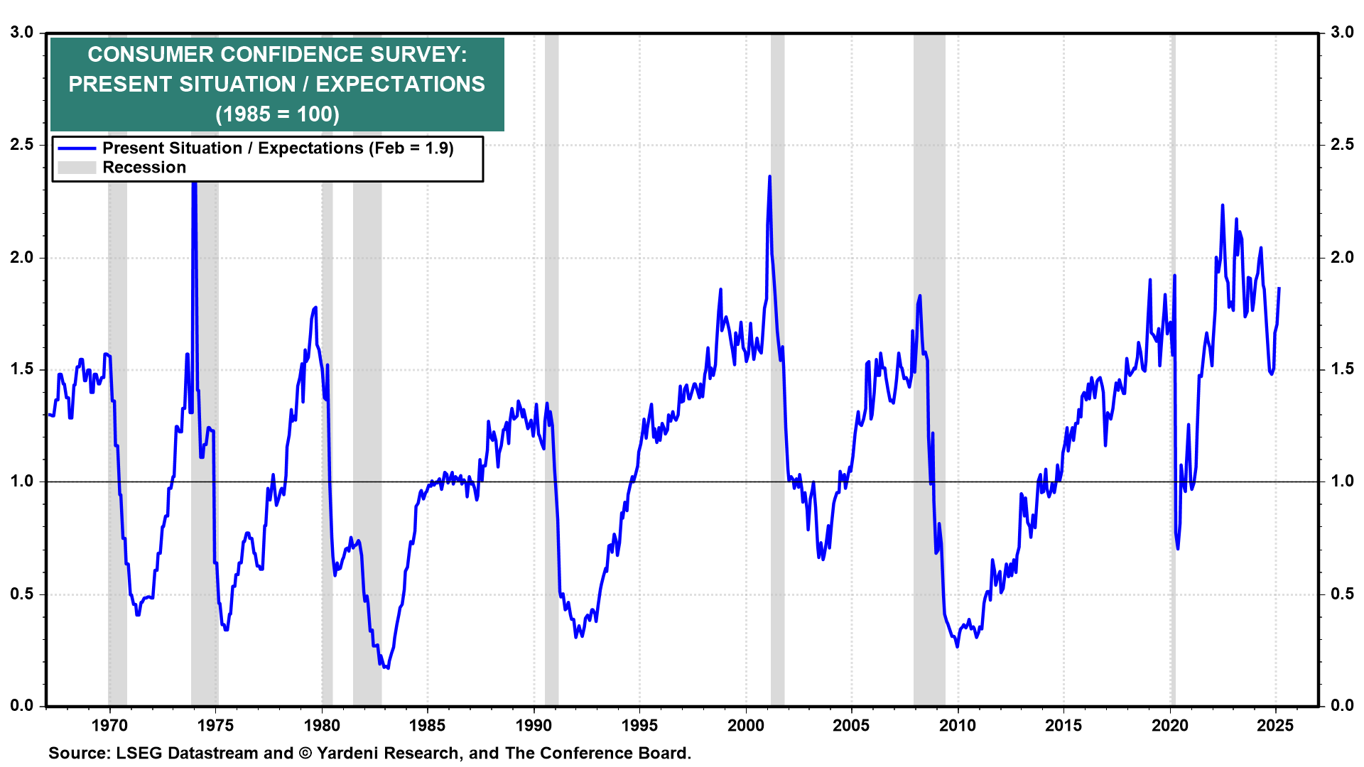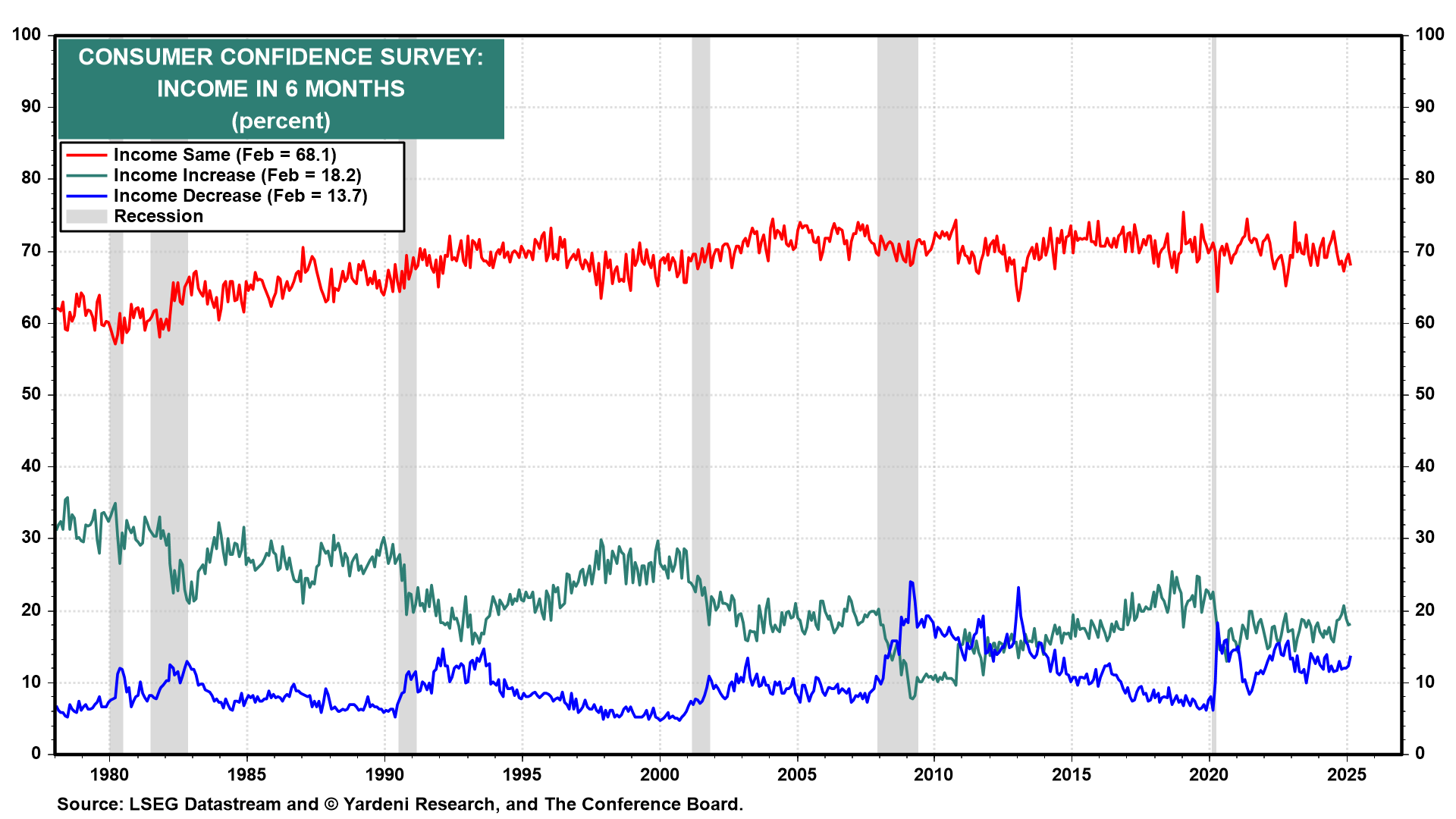 (5) The drop in the CCI expectations component reflects the decline in the "same number of jobs in 6 months" response from 68.8% during July 2024 to 55.7% currently. The "fewer jobs in 6 months" response jumped from 21.0% in January to 25.9% in February. This may reflect all the news about federal job reductions under Trump 2.0.