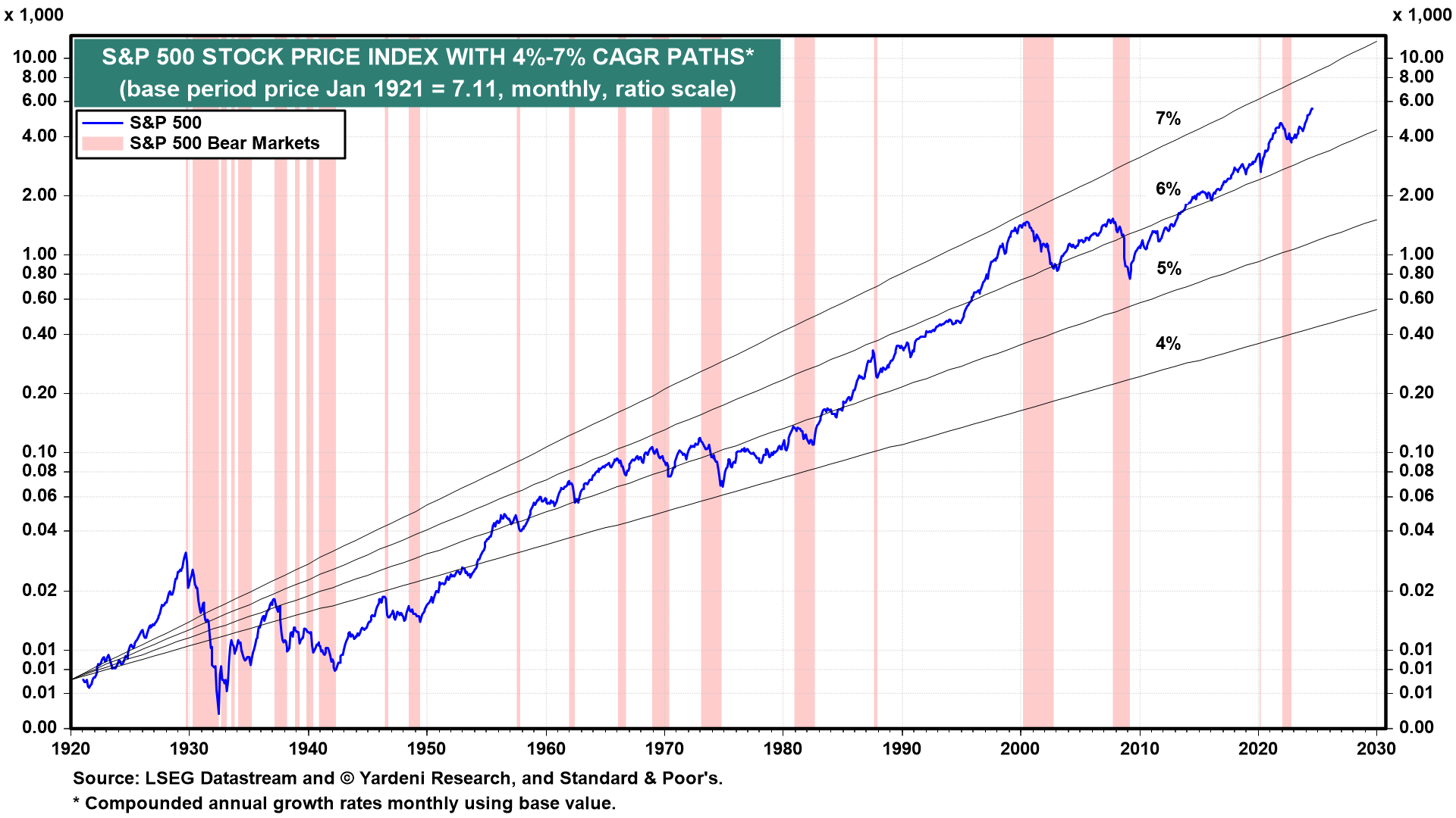 (3) The S&P 500 stock price index is driven by its earnings per share (EPS), which has been growing mostly between 6% and 7% since the 1950s. EPS could double to $400 by the end of the decade in our Roaring 2020s scenario.