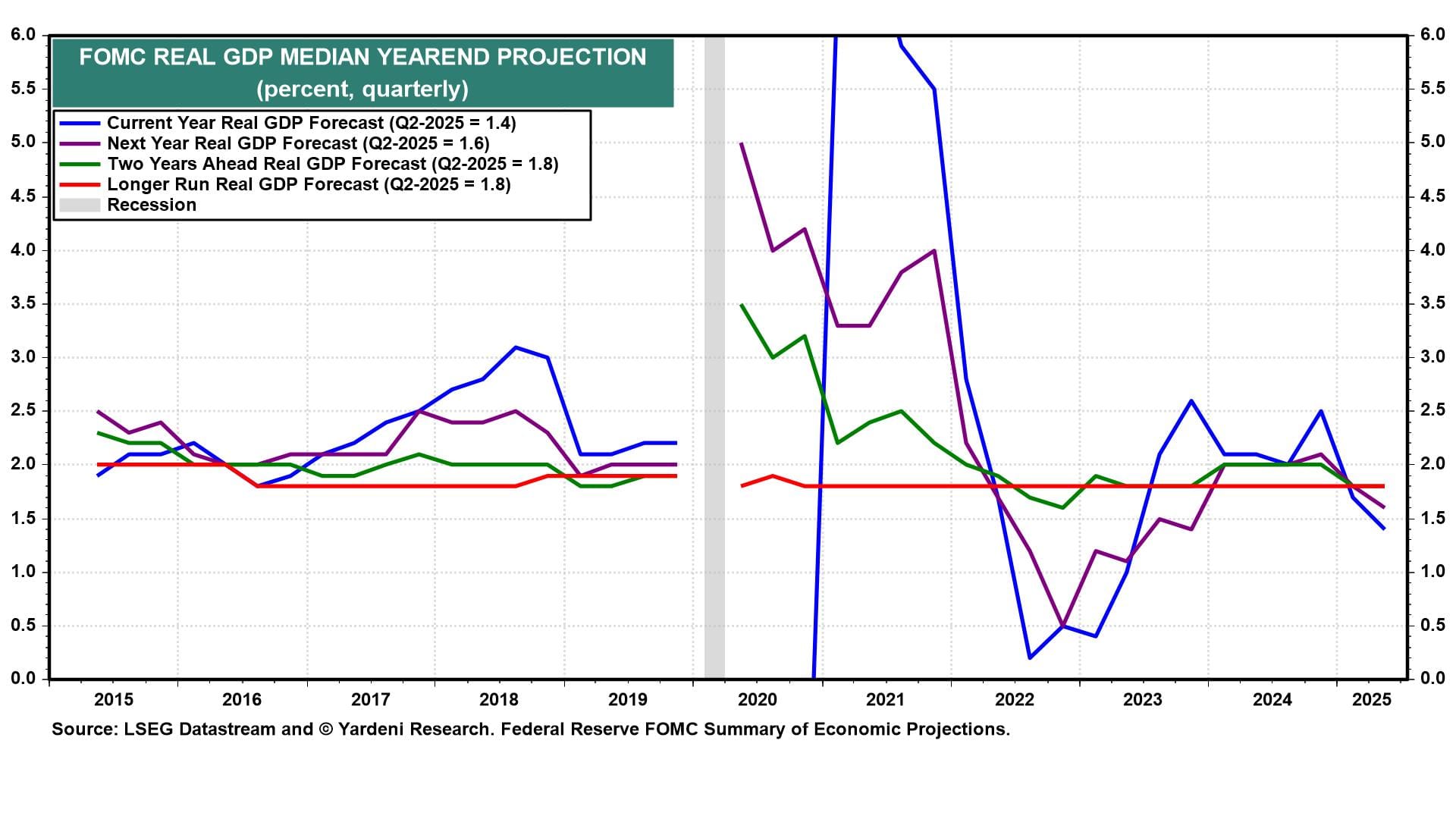 (1) Real GDP. The FOMC's forecast for current-year growth of 1.4% y/y seems awfully low to us given the persistent strength of the labor market (chart). It's not much better next year, at 1.6% y/y, or over the longer run at 1.8%. The economy has been growing closer to 2.5%-3.0% y/y over the past three years, and the historical average is 3.1%. Sure, Trump's tariffs and the Middle East war are major concerns. But the economy has been more resilient than the Fed's current assessment of it.