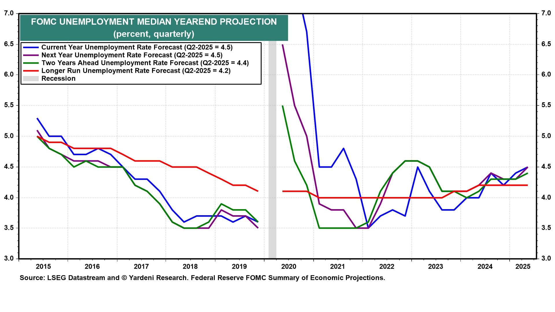 (2) Unemployment rate. The SEP reckons that today's 4.2% unemployment rate is headed to 4.5% by year-end and will remain there in 2026 (chart). That's possible, but would still leave the labor market very close to full employment.