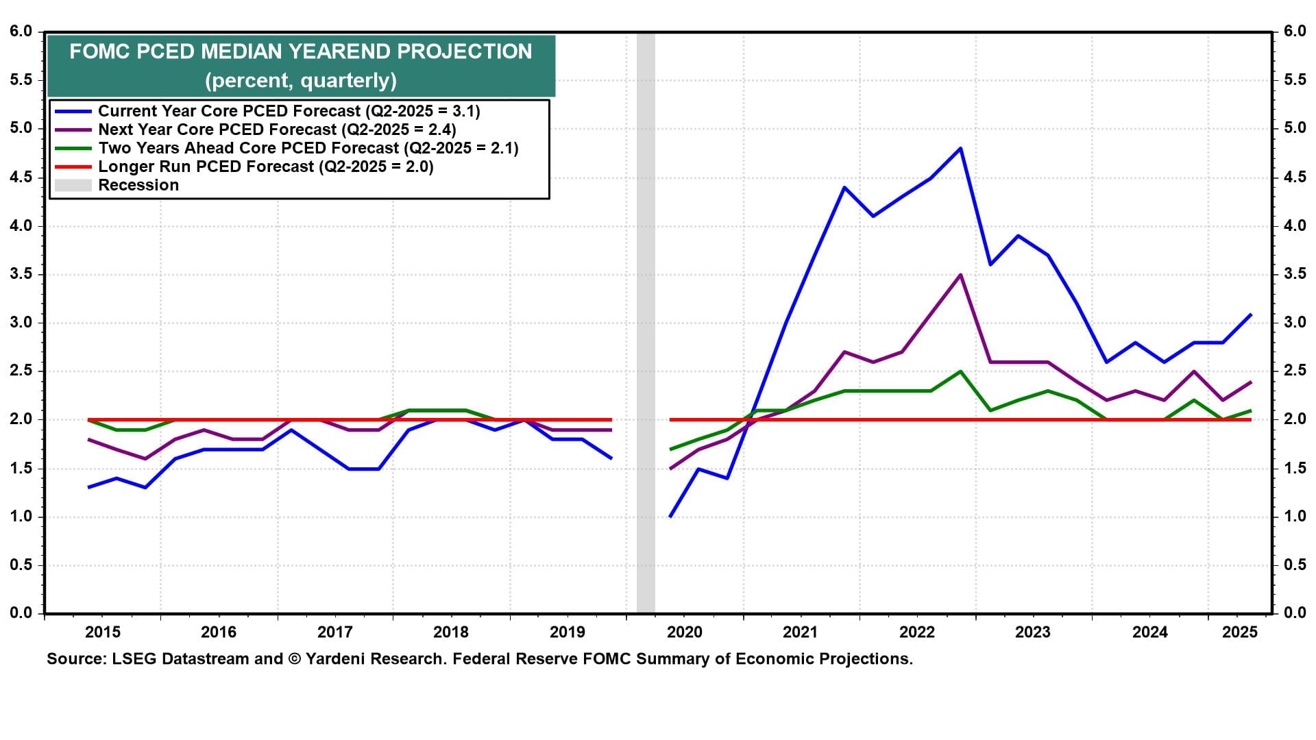 (3) Inflation. The SEP projects that the core PCED inflation rate will be 3.1% in the current year and come down to 2.4% next year (chart). We agree with that relatively subdued outlook for inflation under the circumstances.