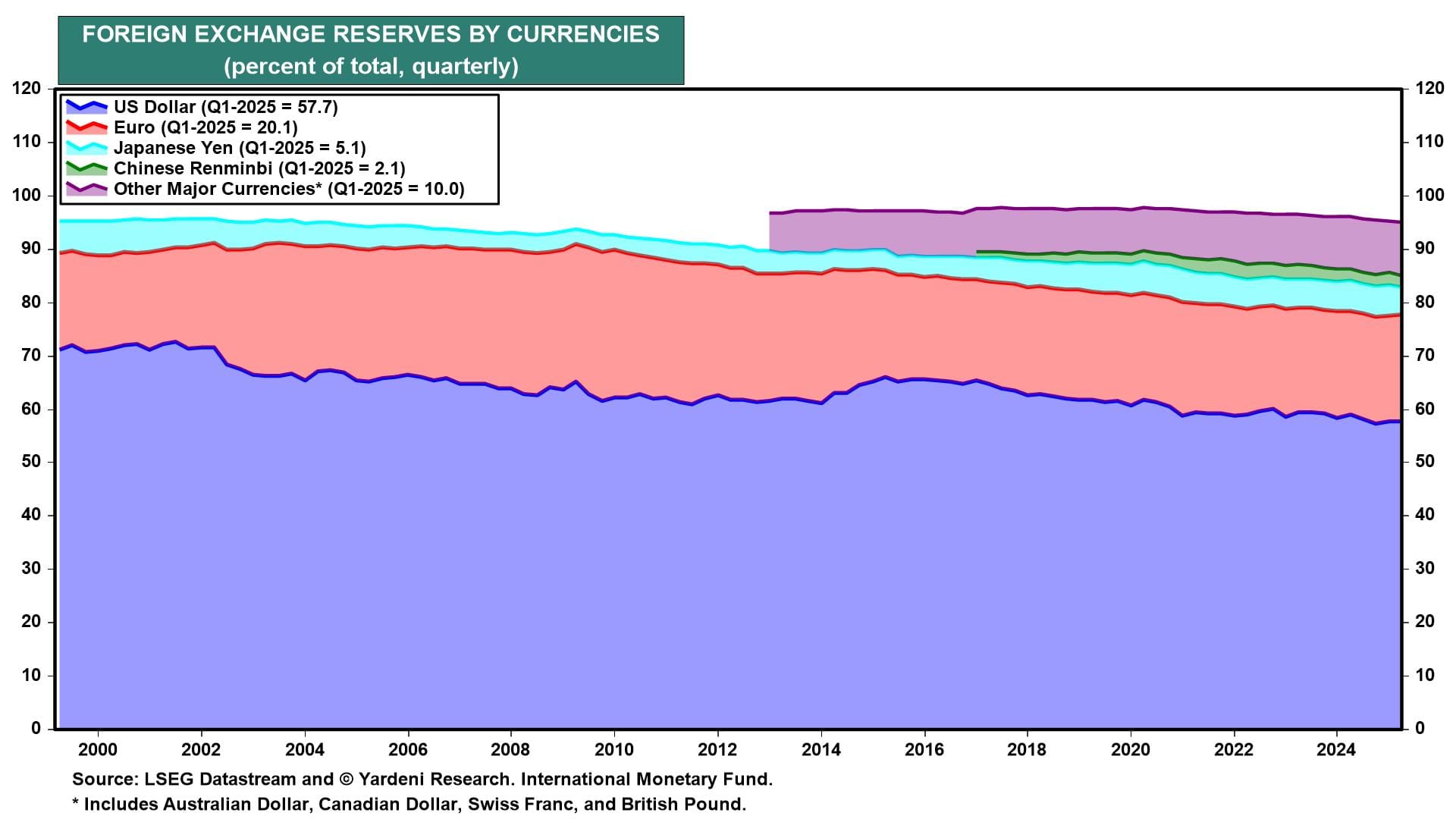 (6) The US dollar accounted for 57.7% of foreign exchange reserves during Q1-2025, according to IMF data (chart). The euro accounted for 20.1%, while the yen accounted for only 5.1%.