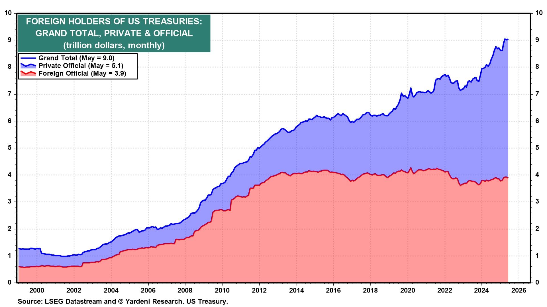 (5) Private foreign accounts held a record $9.0 trillion in US Treasuries during May (chart). Foreign official accounts' total holding of US Treasuries has been relatively flat at around $4.0 trillion since 2012. So recent years' growth in overseas demand has come from private foreign accounts. As global wealth has increased, so has the demand for US Treasuries, which remain the safest asset in the world.