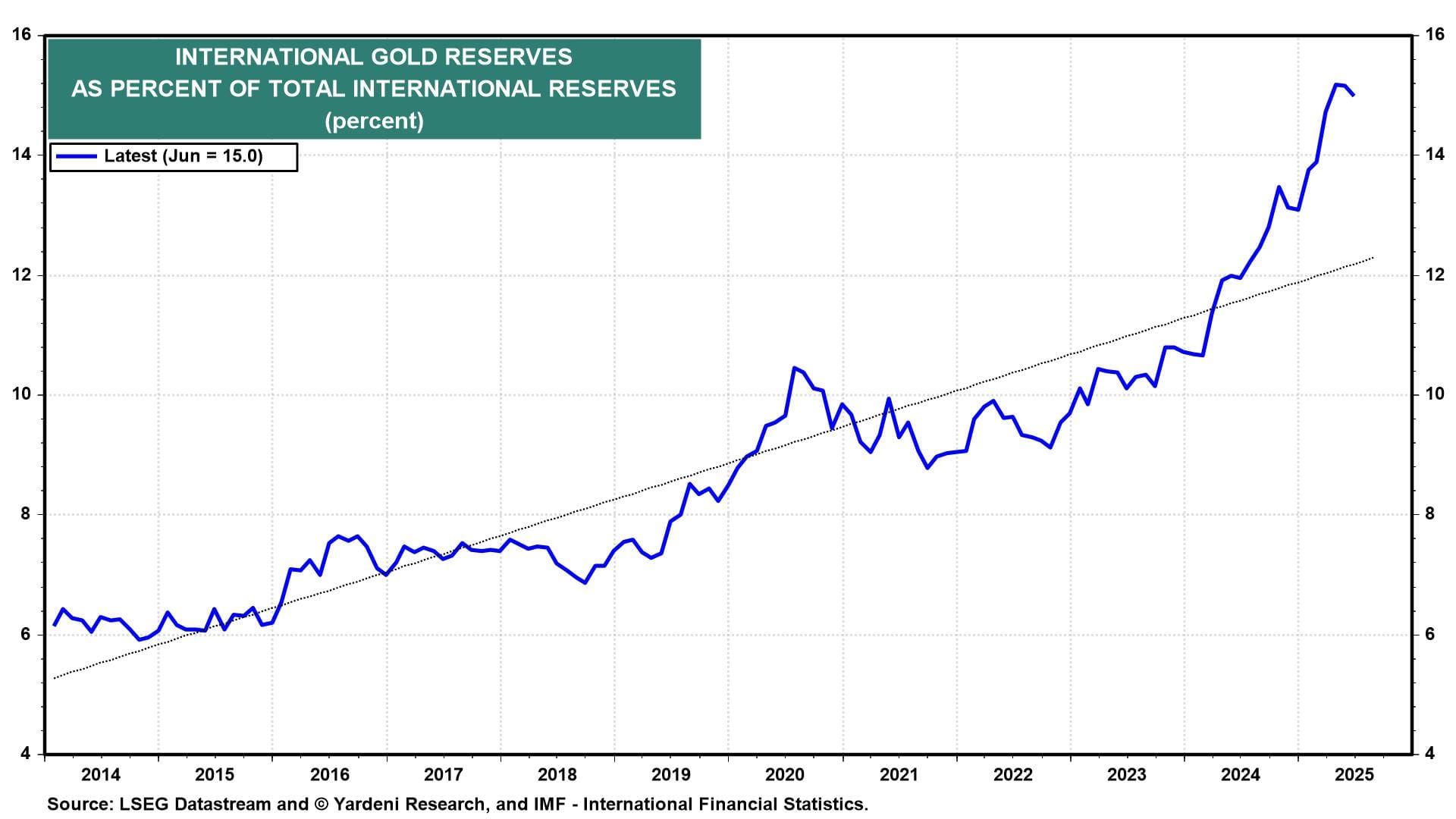 (7) Some of the recent weakness in the dollar might reflect the fact that gold's share of international reserves has been increasing since the US froze Russia's reserves when the country invaded Ukraine in 2022 (chart). The central banks of countries hostile to US interests have been buying more gold and holding onto fewer dollars as a result. That has been bullish for the price of gold.
