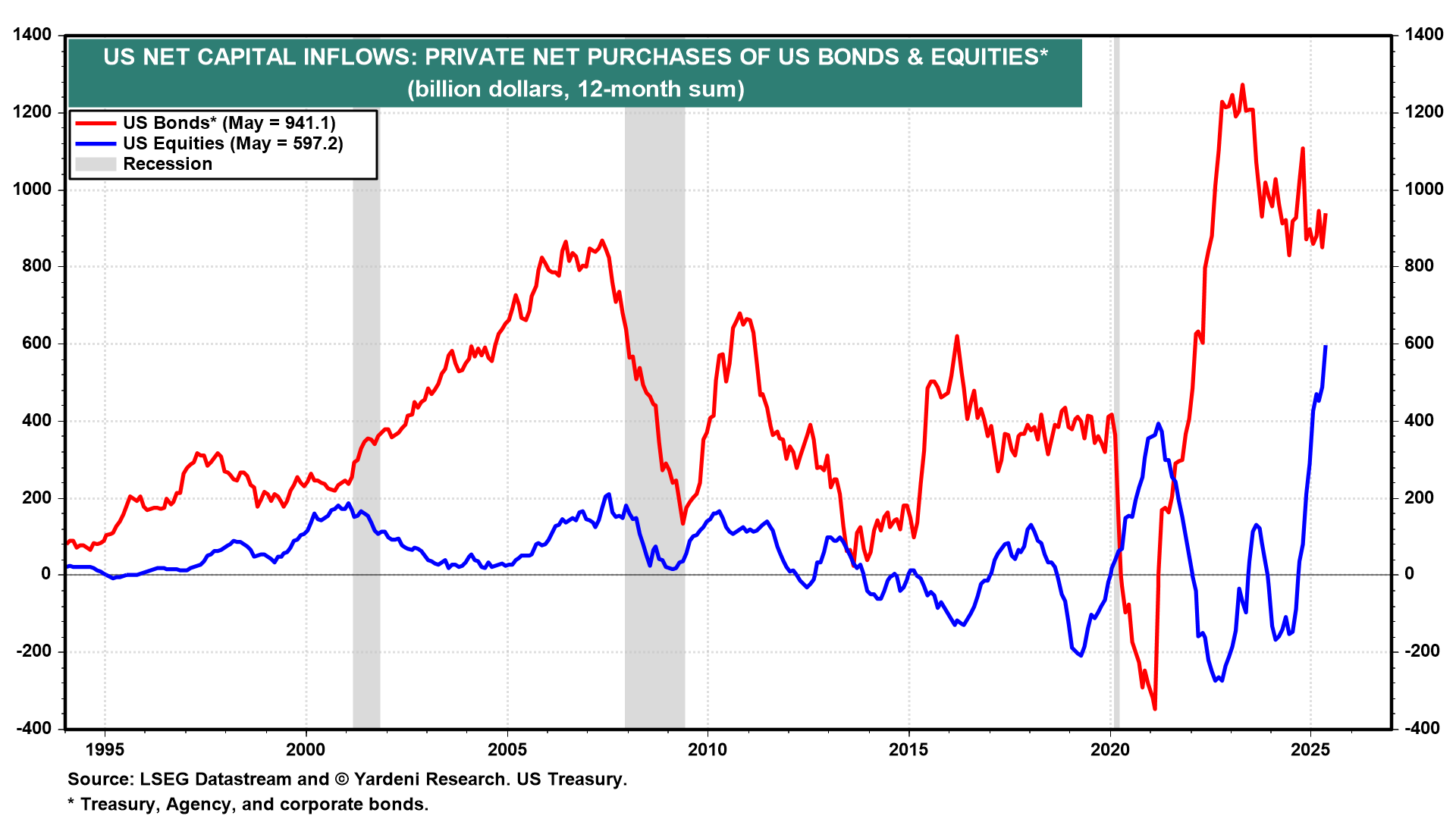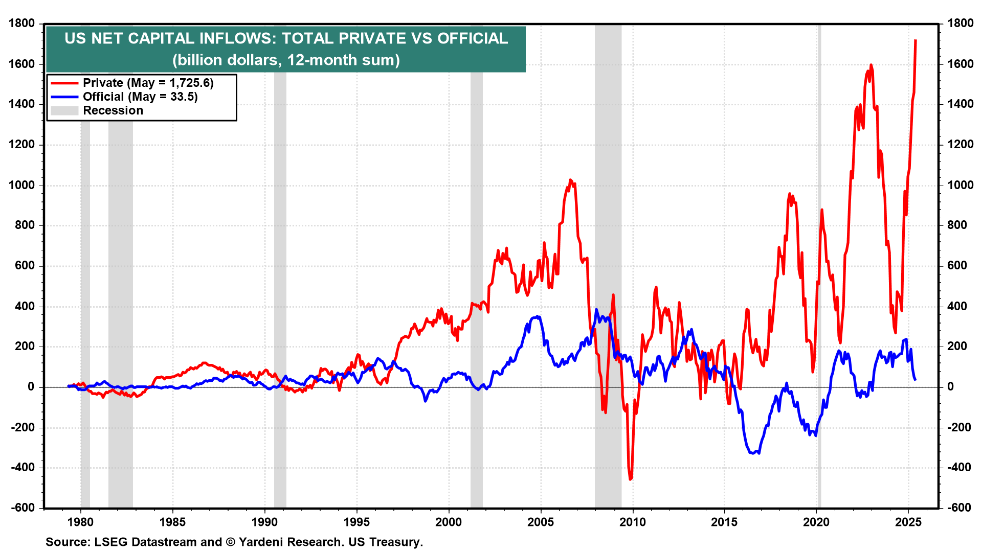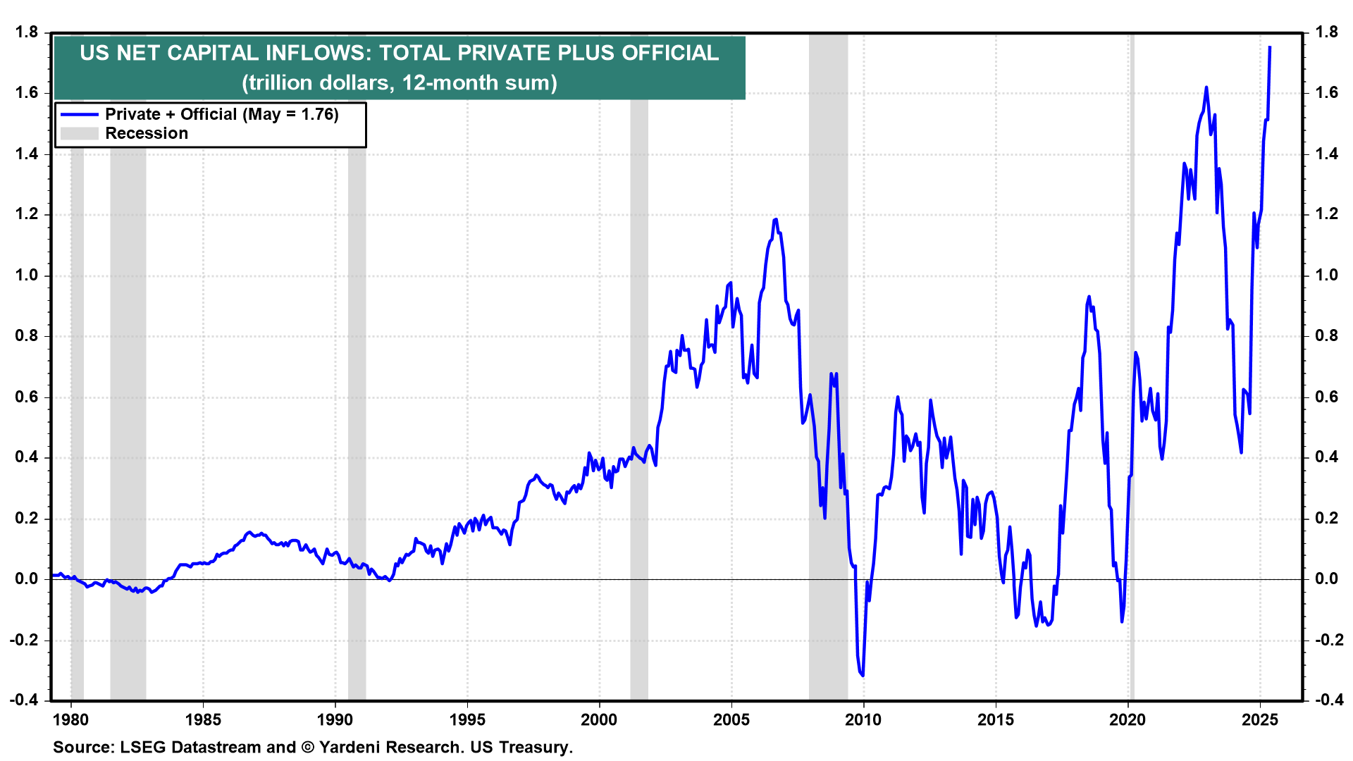 (2) The US has the largest and most diversified capital markets in the world. Foreign investors are attracted to the liquidity and relative safety of the US capital markets. Indeed, over the past 12 months through May, their US net capital inflows attributable to private plus official foreign accounts totaled a record $1.76 trillion (chart)!