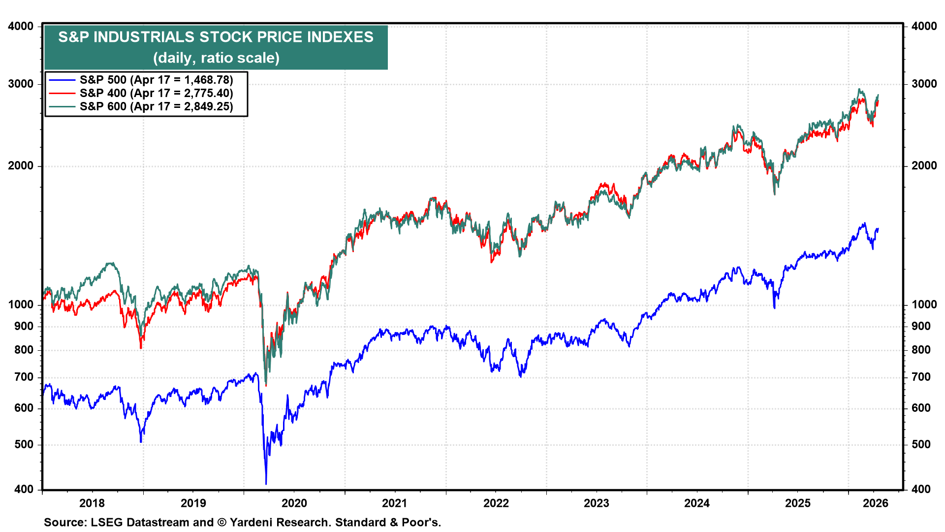 We continue to recommend overweighting the Industrials sectors in the S&P 500, the S&P 400, and the S&P 600. Granted, their valuation multiples are high, but so are their earnings growth rates. The sector's three major indexes all remain on solid uptrends that started in 2022 (chart).