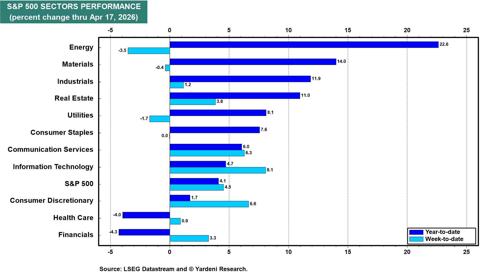 The S&P 500 Industrials sector is up 11.9% ytd, the third-best performing sector behind Energy and Materials (chart). Thursday's March industrial production report showed a 0.5% m/m decline. However, the decline was driven by weather-related utility output and a drop in motor vehicle production, which should rebound in April since auto sales were strong in March. The index remains near its all-time high and is up 0.7% y/y.