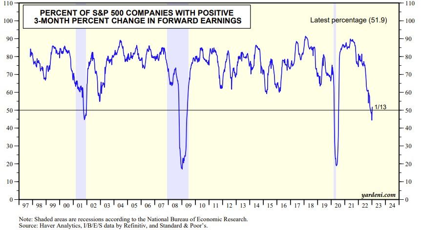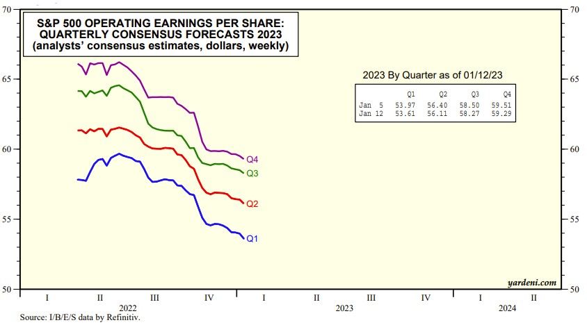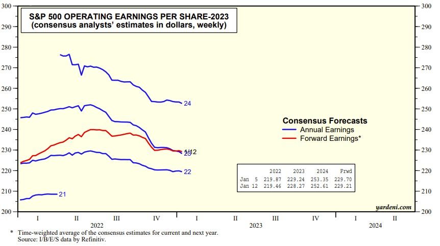 They must have gotten the soft-landing memo rather than the hard-landing one. We are still at $225 per share for this year and $250 for next year. Hard landers are forecasting $200 or even less for this year. (We tend to revise our forecasts if necessary following earnings seasons. See YRI S&P 500 Earnings Forecast.)