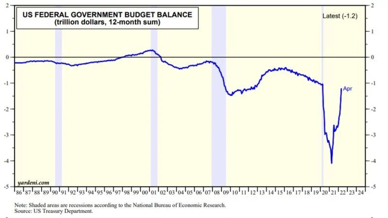 (1) The federal budget deficit, on a 12-month-moving-average basis, has narrowed significantly from its record high of $4.1 trillion through March 2021 to just $1.2 trillion through April of this year. Outlays, also on a 12-month basis, have dropped 20% since they peaked at a record $7.6 trillion during March 2021 through April of this year.