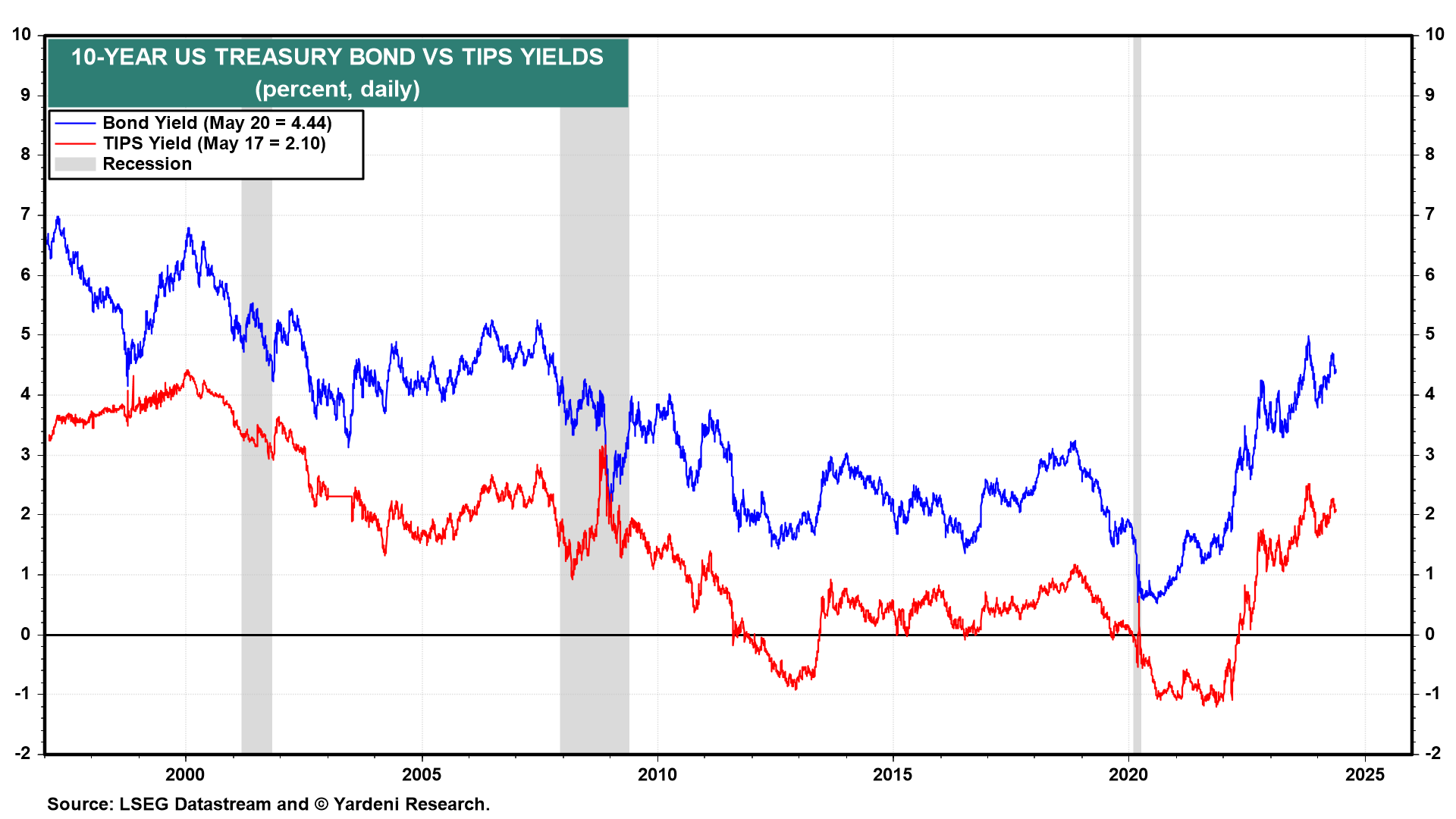 The 10-year nominal bond yield is equal to the 10-year TIPS yield plus the spread between the two yields, which is a widely used market-based proxy for expected inflation over the next 10 years. We expect that the TIPS yield will continue to hover around 2.00%-2.50% for a while as it did before the GFC.