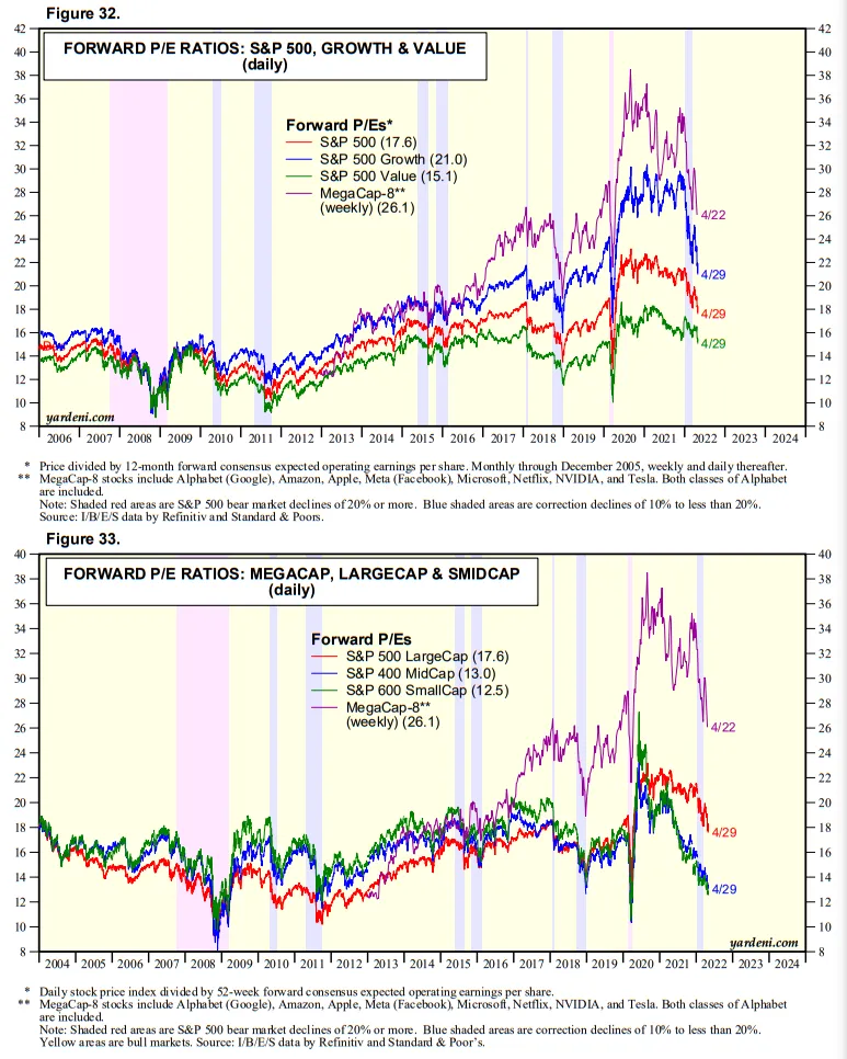 We’ve been thinking that the S&P 500’s forward P/E might range between 16.0 and 19.0 this year. Looks like it’s moving quickly toward the bottom end of this range. Investors clearly are discounting a rising probability of a recession. Meanwhile, industry analysts continue to raise both their revenues and earnings estimates to record highs. The analysts are probably seeing that inflation is boosting both of these variables, while investors are worrying that the Fed will cause a recession, either by accident or by design, to bring down inflation.