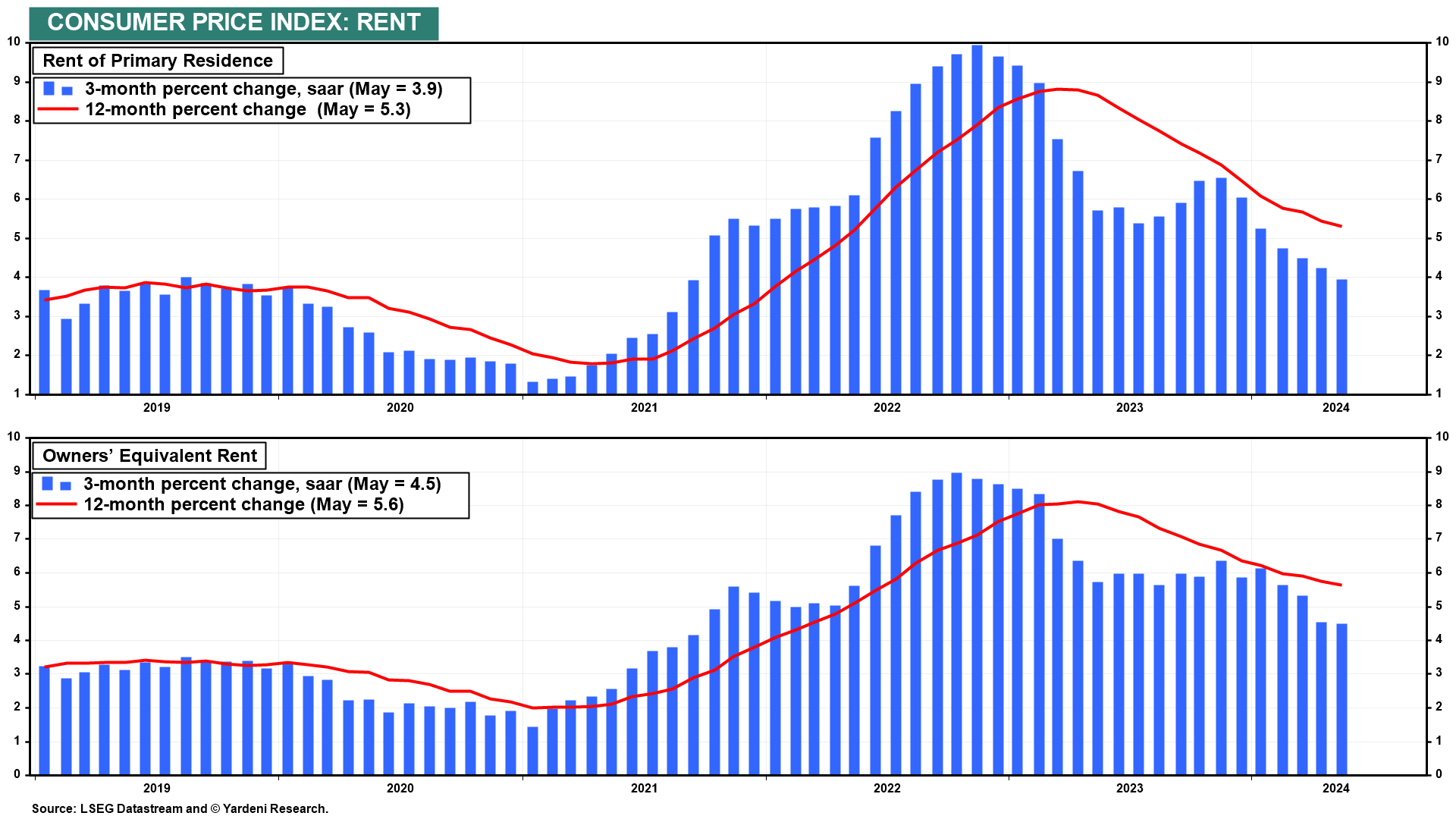 (1) Headline and core inflation. May's headline CPI inflation rate was zero m/m and 3.3% y/y. The core CPI inflation rate rose 0.2% m/m and 3.4% y/y, the lowest reading since April 2021. Excluding shelter, headline and core CPI inflation rates are now at 2.1% and 1.9% y/y (chart).