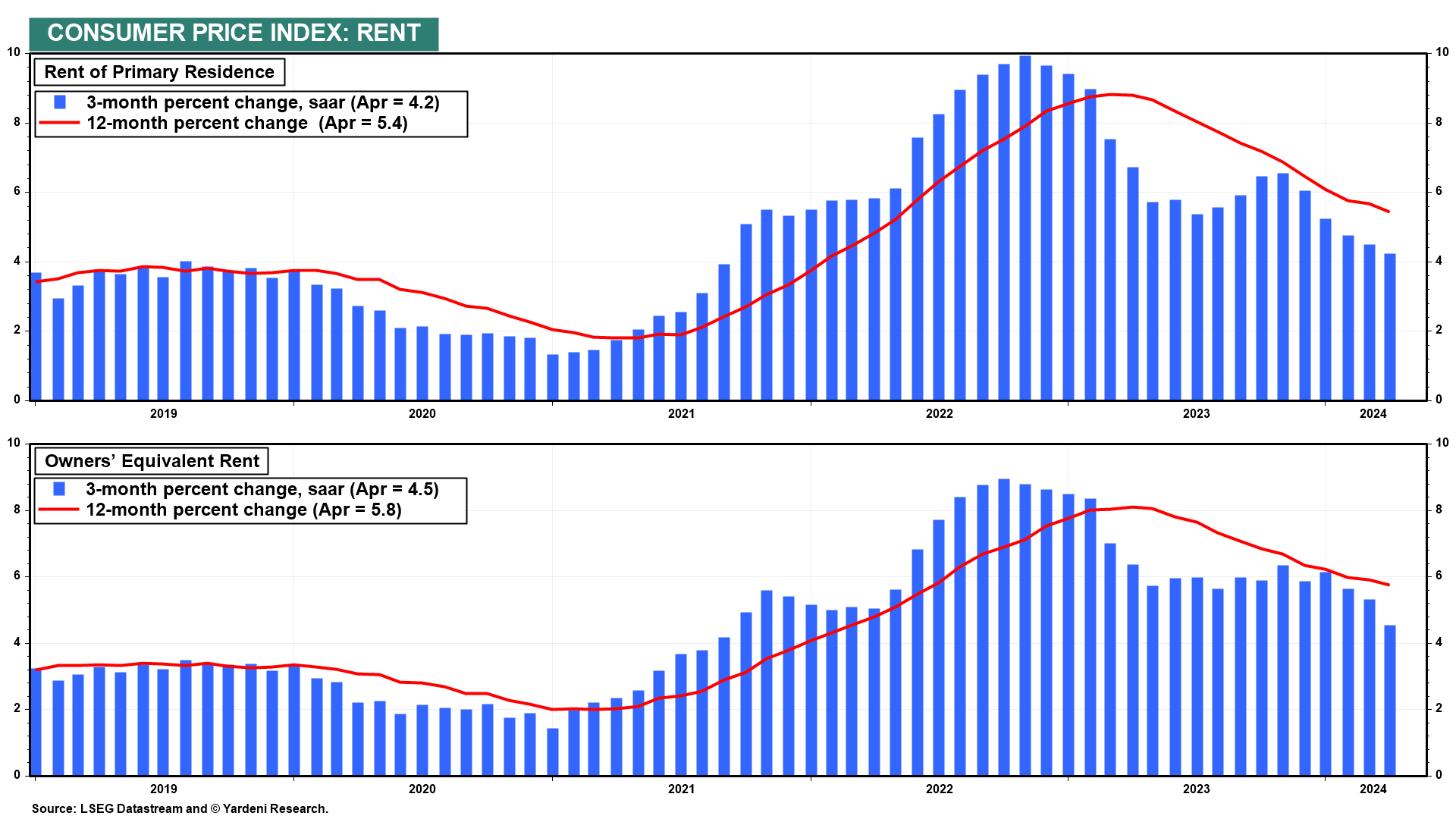 (2) Both rent of primary residence and owner’s equivalent rent continued to disinflate in April (chart).