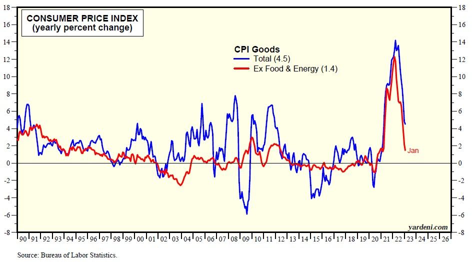 The CPI for all consumer goods rose 4.5% y/y in January, down from 4.8% in December and down from the March 2022 peak of 14.2% (chart). Fed Chair Jerome Powell recently remarked that consumer goods prices are disinflating. They certainly are doing just that.