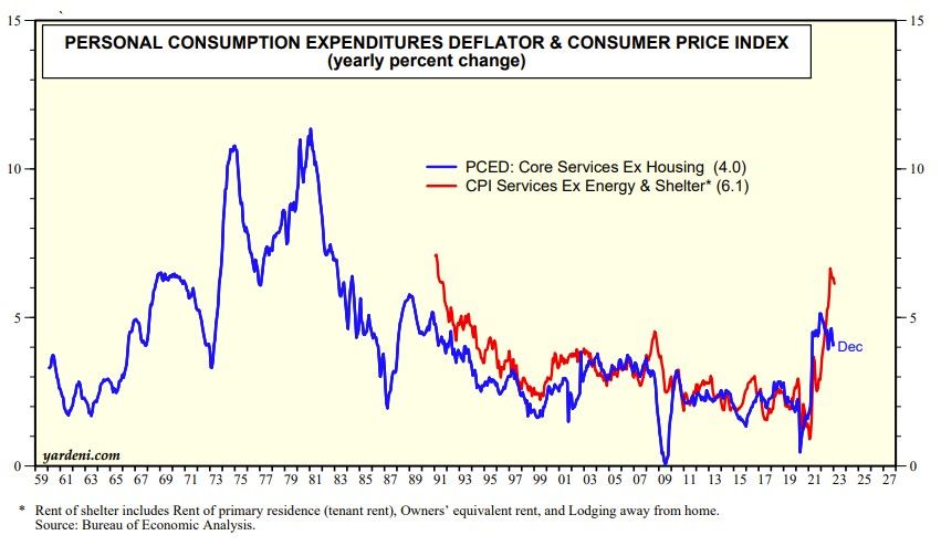 The Fed’s focus in recent months has been on core PCED services inflation excluding housing costs. Fed officials are troubled that it has been stuck around 4.0%-5.0% over the past year (chart). The CPI version of this series didn’t provide any relief. It was up 6.1% y/y during January, only slightly below its 2022 near-record high of 6.6% during September.