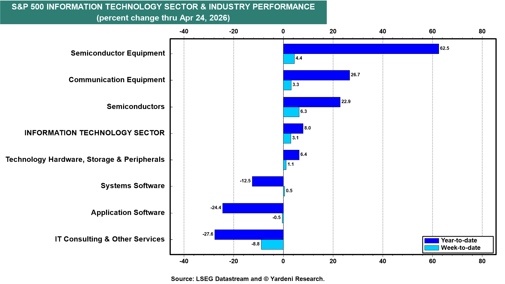 Focusing now on the S&P 500 Information Technology sector, it is up 8.0% ytd. However, there is an unusually large spread between the winners and the losers (chart). The former are all IT hardware industries that stand to benefit from rapid AI adoption, while the latter include IT software and services that face existential risks from AI replacement. It's a classic example of Joseph Schumpeter's creative destruction model of capitalism.