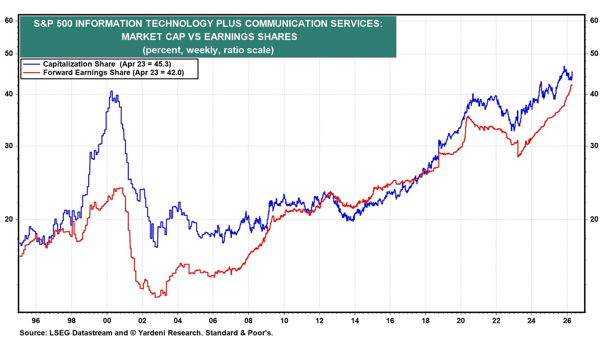 We lowered the S&P 500 Information Technology and Communication Services sectors from overweight to market weight on December 7, 2025. We did so because the two sectors together accounted for 45% of the S&P 500's market capitalization (chart). We were also concerned about the mounting uncertainties regarding the rate of return on hyperscalers' massive AI investments.