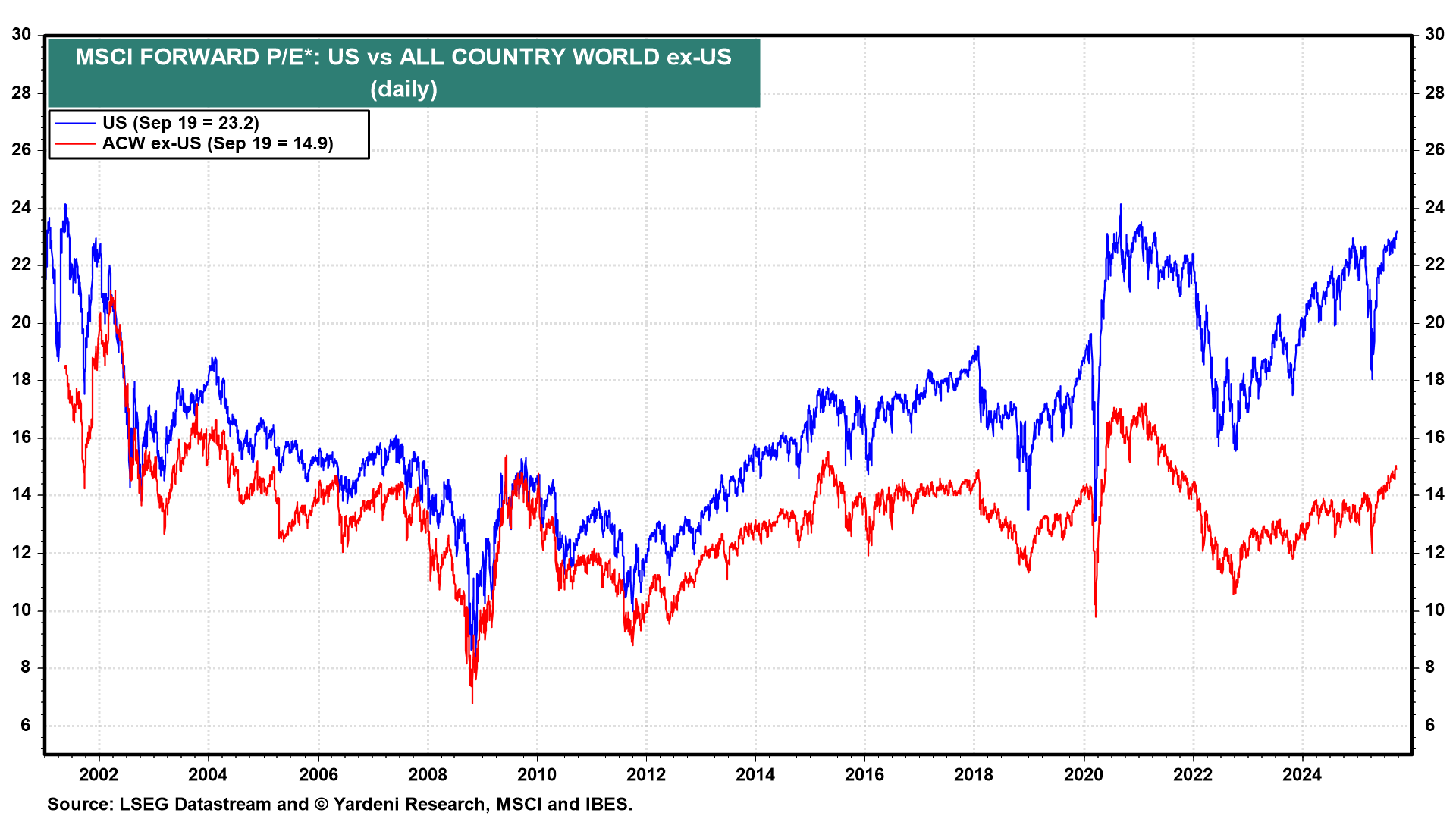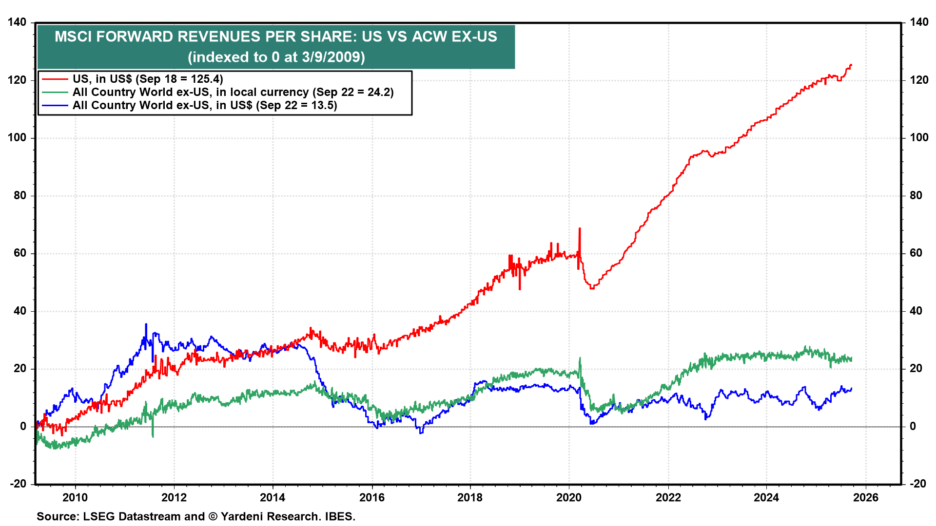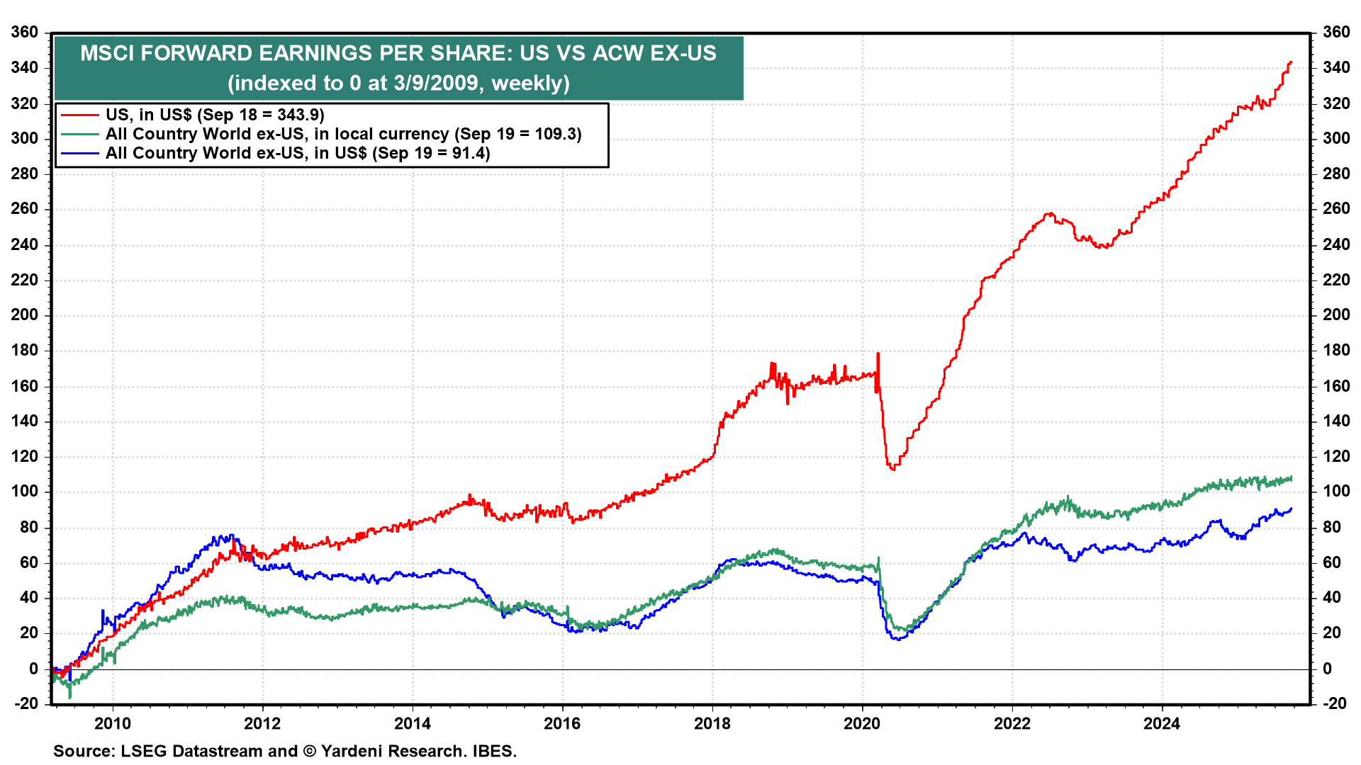 We can also observe the outperformance of the US by tracking the ratios of the US MSCI stock price index to the ACW ex-US MSCI stock price index in both local currency and in US dollars (chart). Both remain on solid uptrends even though the US has been a global underperformer so far this year, especially in dollars.