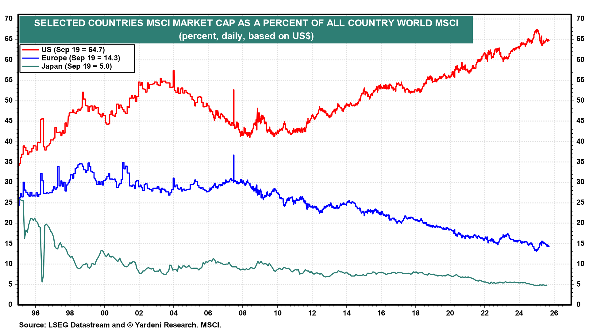 It's a big world with lots of investment opportunities. We continue to favor the United States, but it's hard to overweight the US when it already accounts for 64.7% of the market capitalization of the All Country World (ACW) MSCI (chart). That's up from a low of 42.0% in late 2009.
