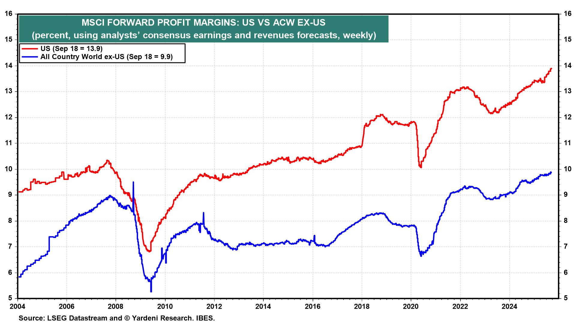 The companies in the US MSCI collectively also have had a higher forward profit margin than companies in the rest of the world (chart). Currently, the US margin is 13.9%, compared to 9.9% for the rest of the world.