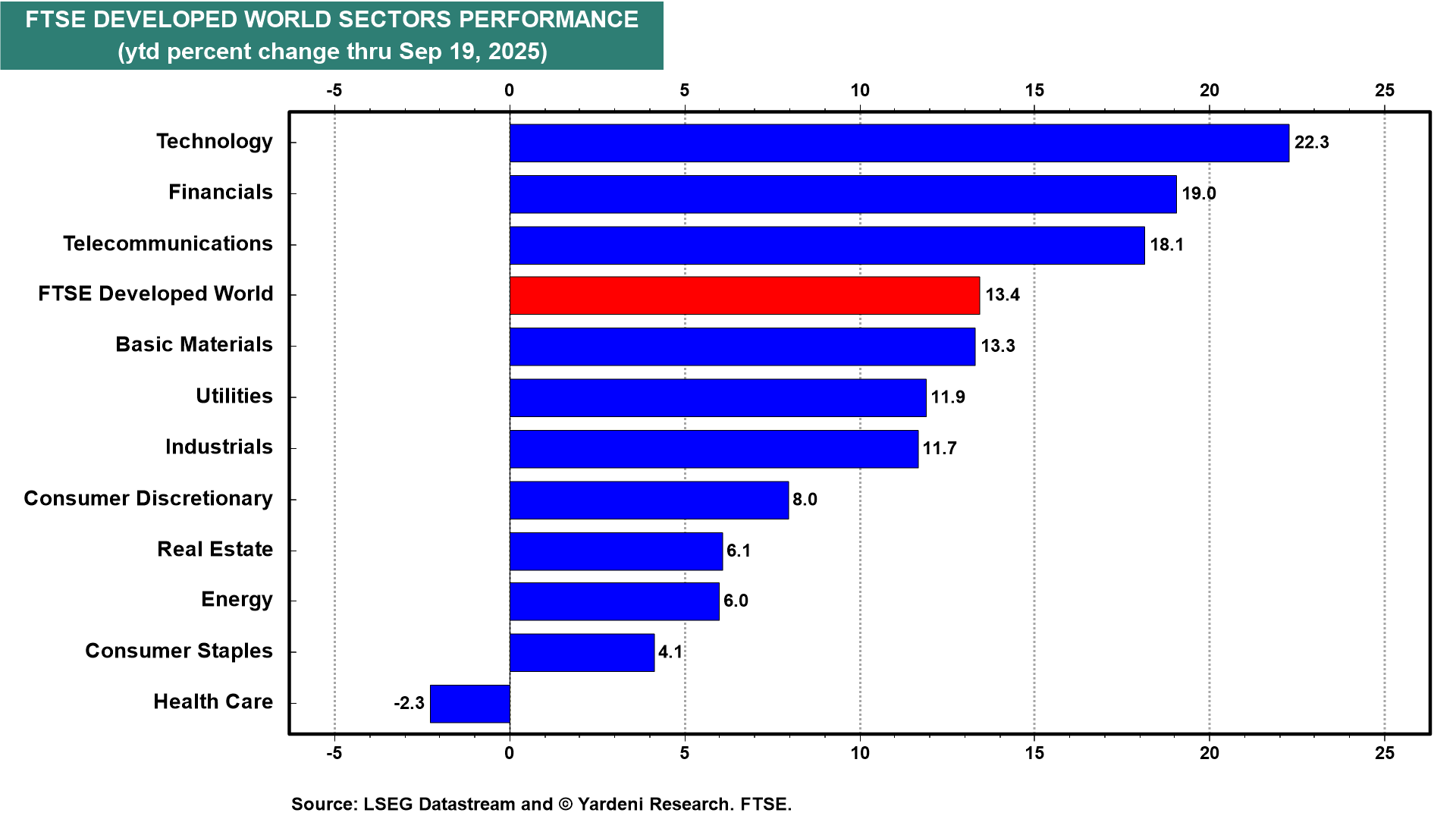 We have been drilling down into the FTSE sectors around the world on a ytd basis. (See our FTSE Country Sector Performance.) One conclusion is that the outperforming sectors of the Developed World FTSE so far this year are those that tend to grow fastest in developed economies, namely Technology, Financials, and Telecommunications (chart).