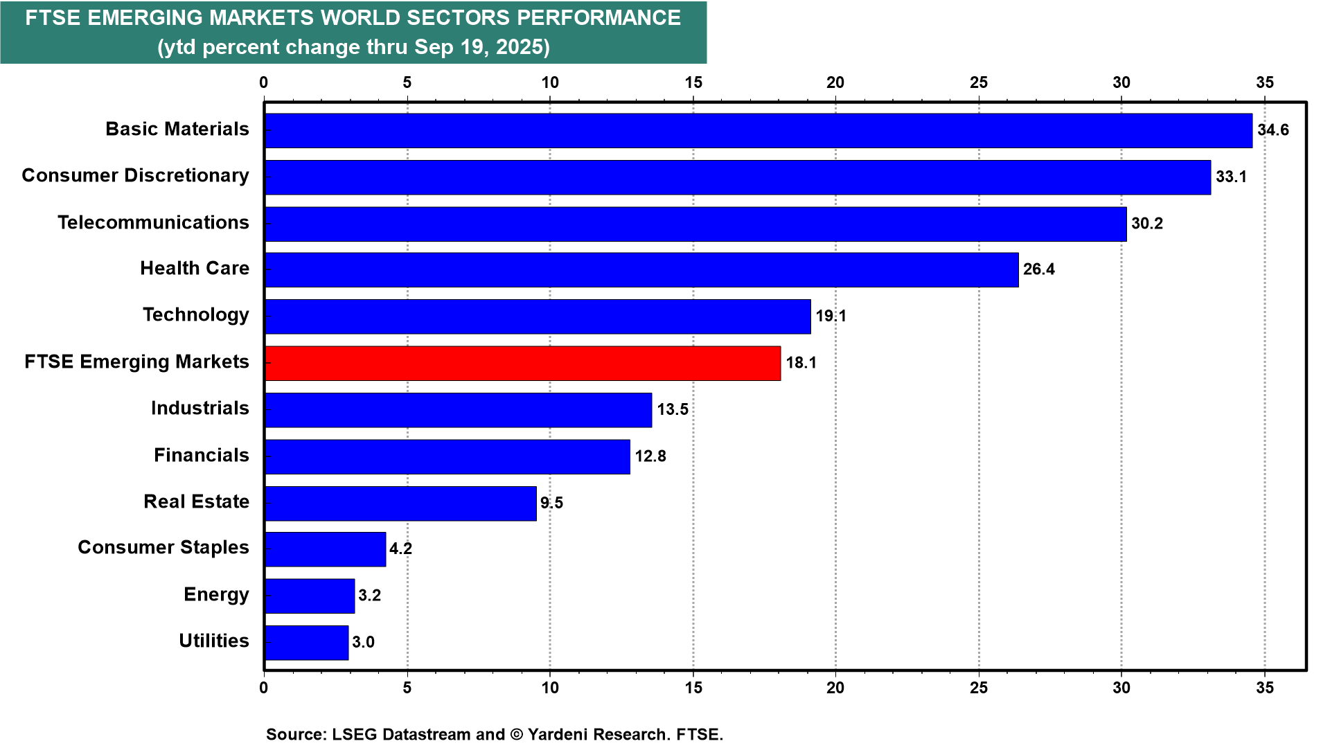 In the Emerging Markets FTSE, the top outperformer is Basic Materials (chart). That makes sense since many EMs are commodity producers. Also performing well are the Consumer Discretionary, Telecommunications, and Health Care sectors. These sectors tend to prosper in countries with relatively young and rapidly growing populations.