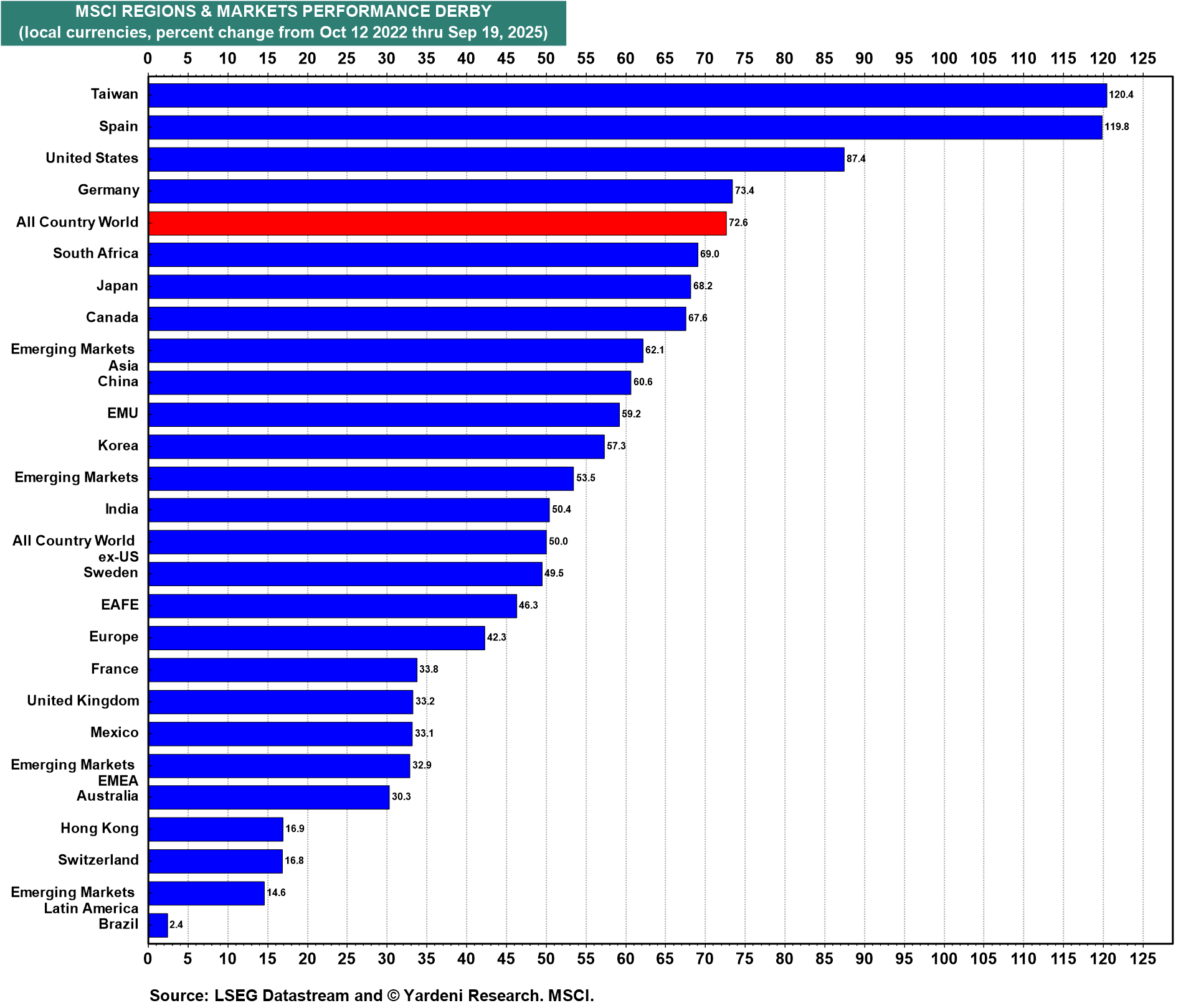 Since the start of the bull market on October 12, 2022, the US MSCI has risen 87.4%, trailing only Taiwan (120.4%) and Spain (119.8%), both in local currencies (chart). So far this year, the US has been an underperformer. That's even truer when the performance of overseas stock markets is adjusted for the weaker dollar.