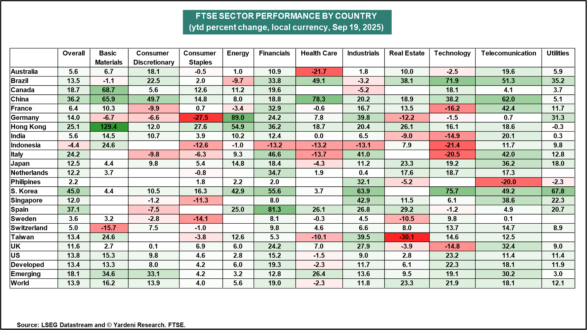 The table below is a useful tool for tracking country and sector performances.