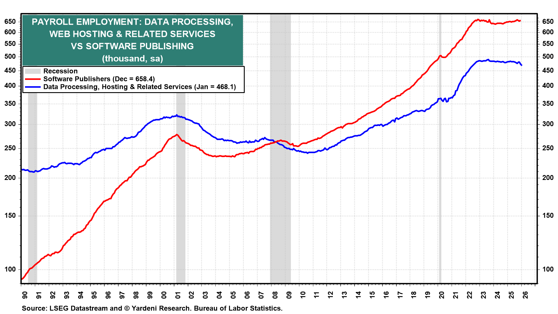 The good news is that bullish sentiment must be dropping rapidly, as the AI story has morphed from a Roaring 2020s productivity booster to an existential threat to our way of life. We continue to believe that AI is augmenting workers' productivity rather than making them extinct.