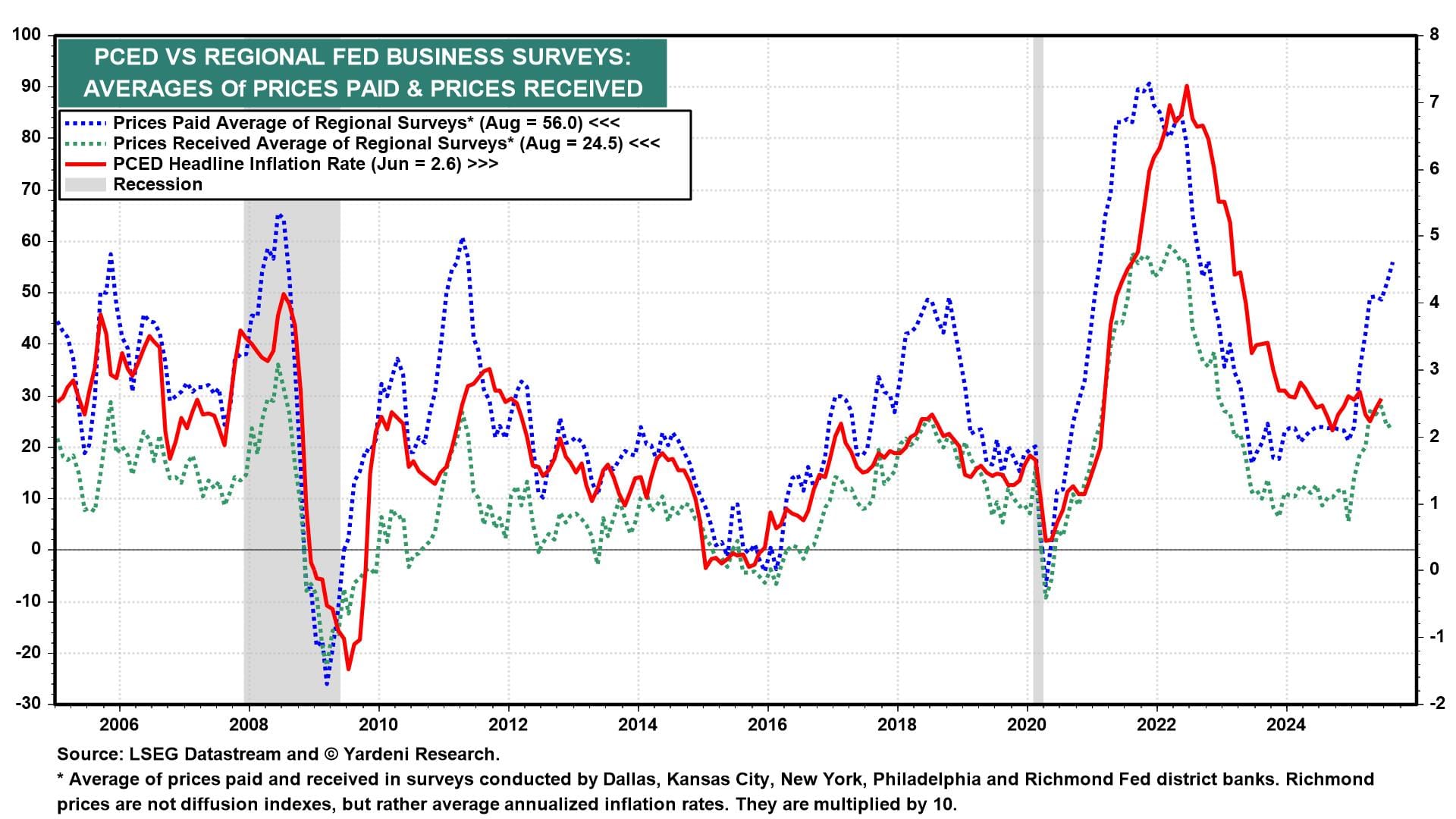 (5) The regional business surveys conducted by five of the 12 Federal Reserve district banks showed that inflationary pressures are building. The average of the prices-paid indexes jumped in August to 56.0, the highest reading since October 2022 (chart). The average of the prices-received indexes is lower at 24.5, suggesting that many companies are absorbing the increasing costs of tariffs and/or offsetting them with productivity gains. More companies may start to pass their costs on to consumers in the coming months.