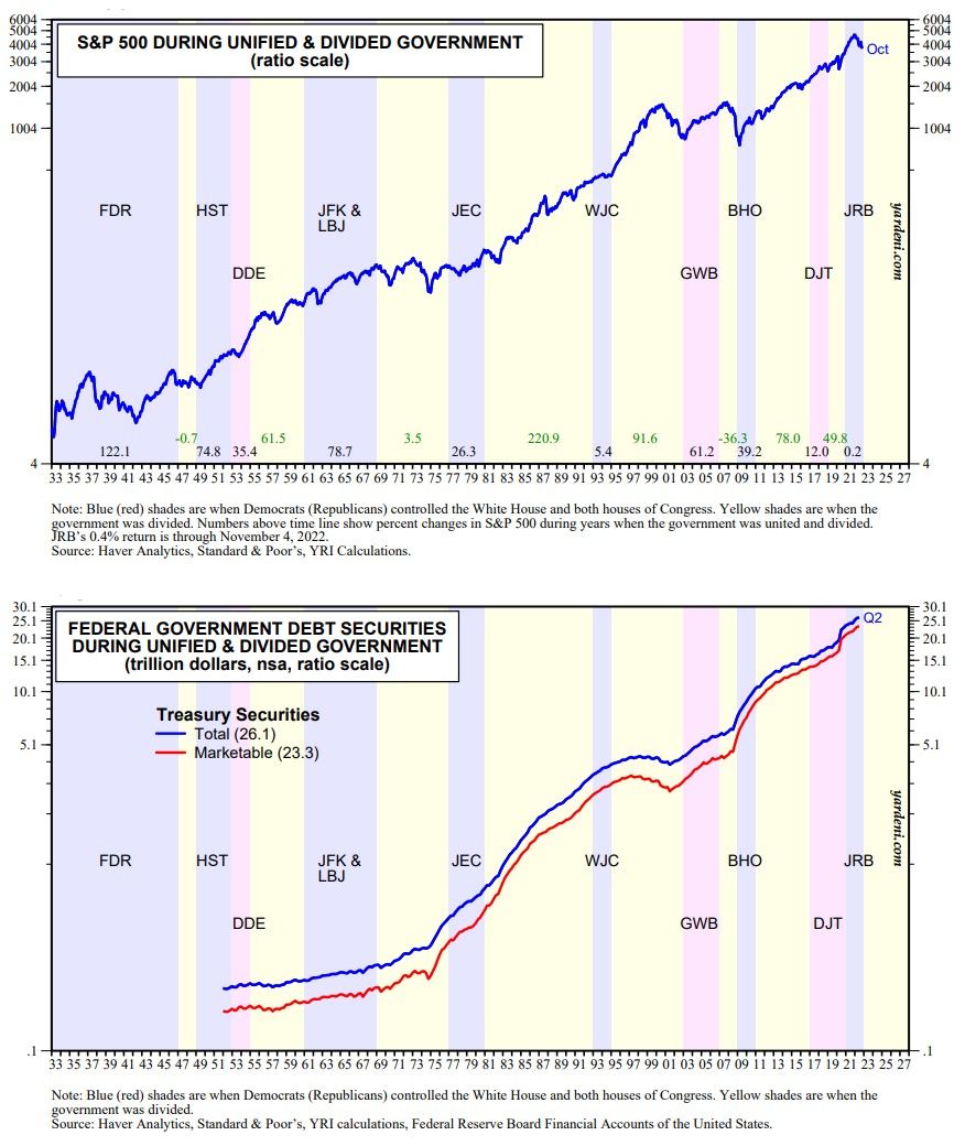 Nevertheless, we can clearly observe that the amount of federal debt outstanding has risen during periods of both unified and divided government (chart). The two parties may fight over federal spending and taxation issues, but they can always agree on paying for budget deficits by issuing more debt. Enabling their fiscal excesses in recent years has been the ultra-easy monetary policies of the Federal Reserve. However, the excessively stimulative mix of fiscal and monetary policies in response to the pandemic caused inflation to soar, forcing the Fed to raise interest rates significantly.