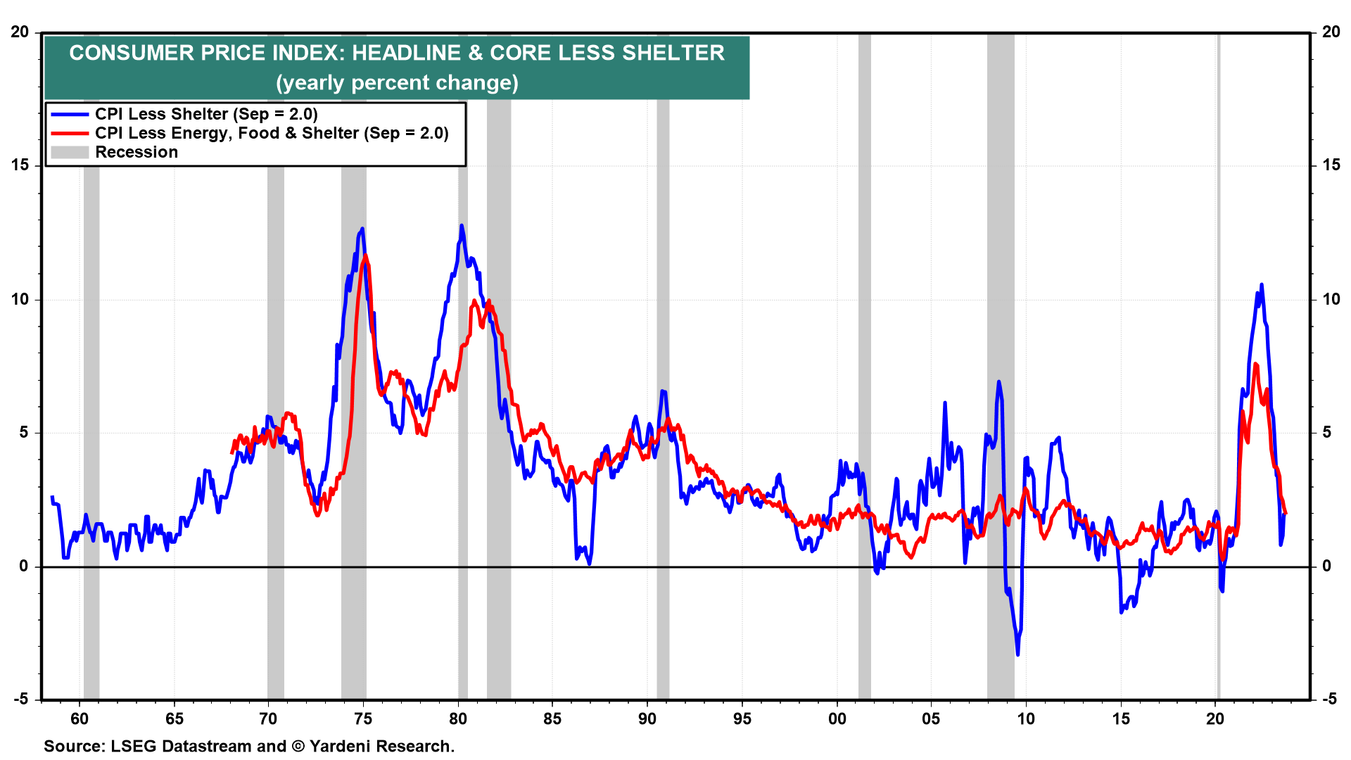(1) The really good news is that the headline and core CPI inflation rates excluding shelter rose just 2.0% each during September (chart). These two measures of inflation have already scored bullseyes on the Fed's 2.0% target! Price inflation has turned out to be remarkably transitory according to them. That's because pandemic-related supply chain disruptions caused prices to spike higher for a while until the bottlenecks were ameliorated.