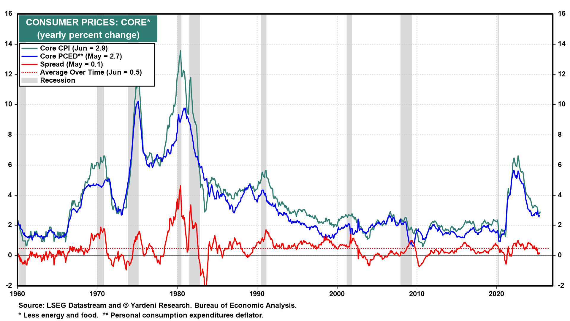 Today's CPI report for June suggests that consumer price inflation is no longer declining toward the Fed's 2.0% target. Instead, it might continue to hover around 3.0% for a while as it has recently (chart). Trump's tariffs may be a contributing factor, though their impact remains debated. The core CPI inflation rate upticked to 2.9% last month, hinting that the core PCED inflation rate (at 2.7% in May) might have followed a similar trend.