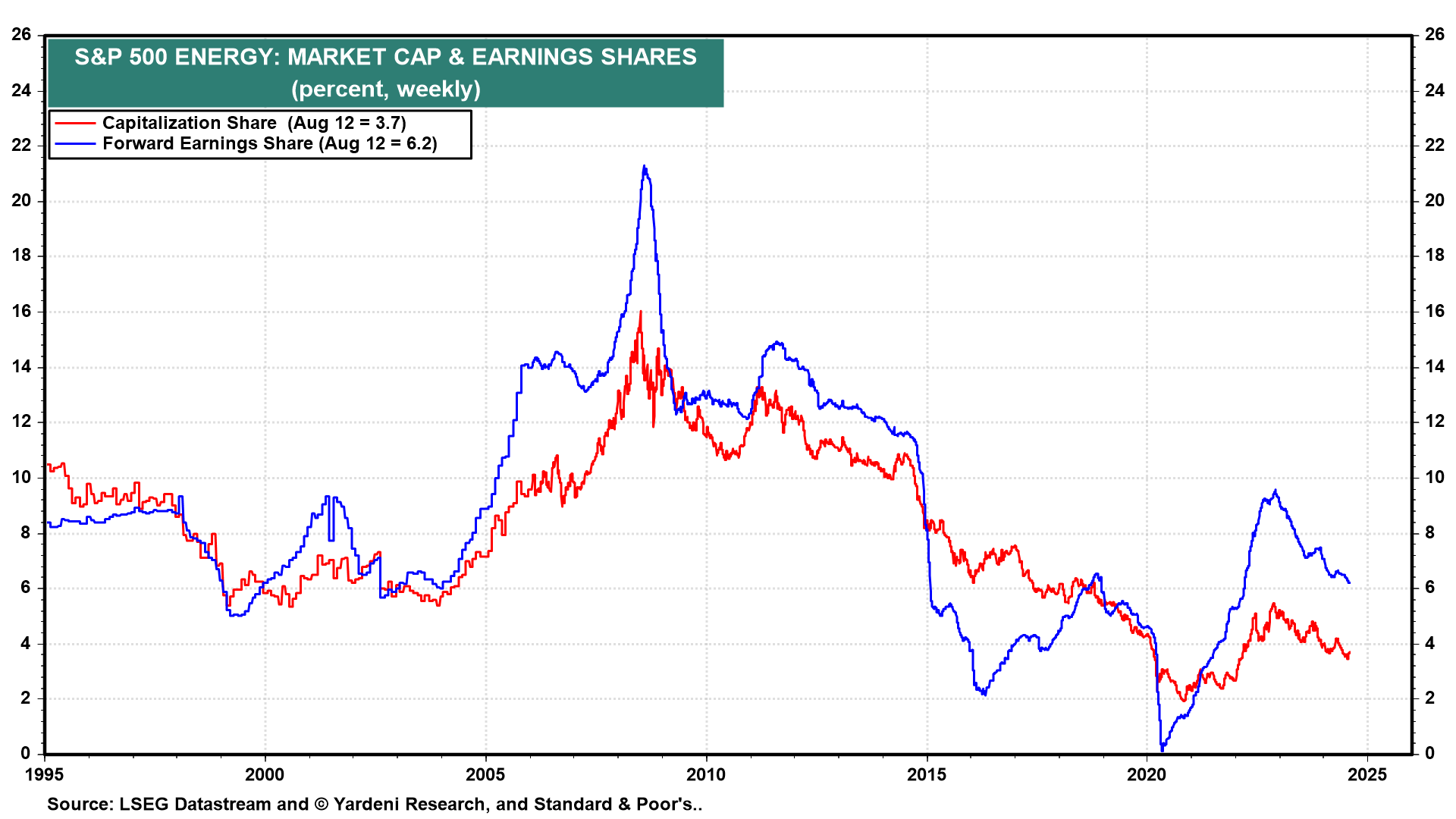 (5) Our Energy sector overweight hasn’t played out as well as our overweights in S&P 500 Tech (Information Technology & Communication Services), Industrials, and Financials. Fortunately, at just 3.7% of the S&P 500 market capitalization, Energy is an easy sector to overweight in a portfolio these days (chart).