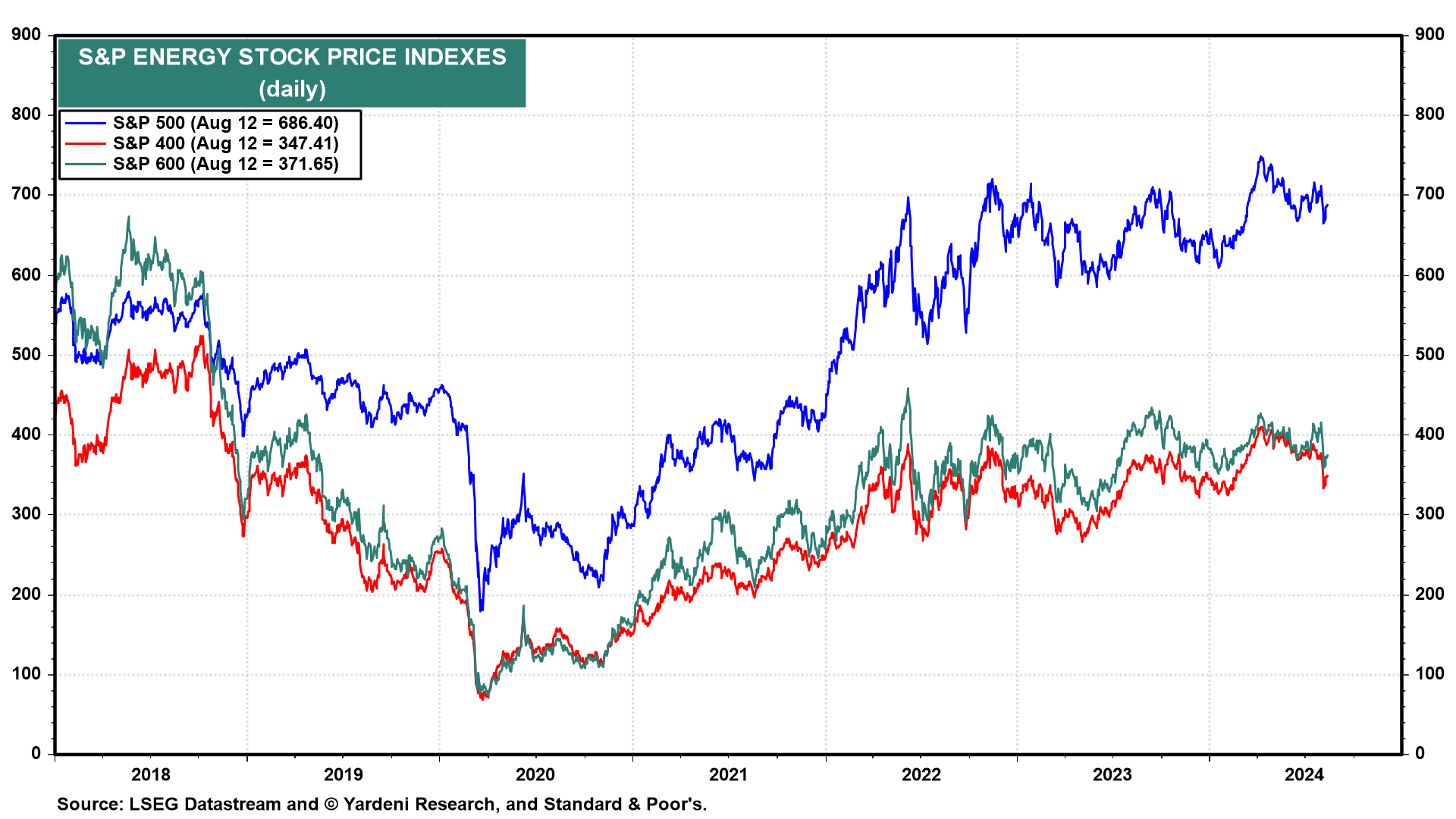 The S&P 500/400/600 Energy stock price indexes have rallied along with oil prices in recent days (chart).