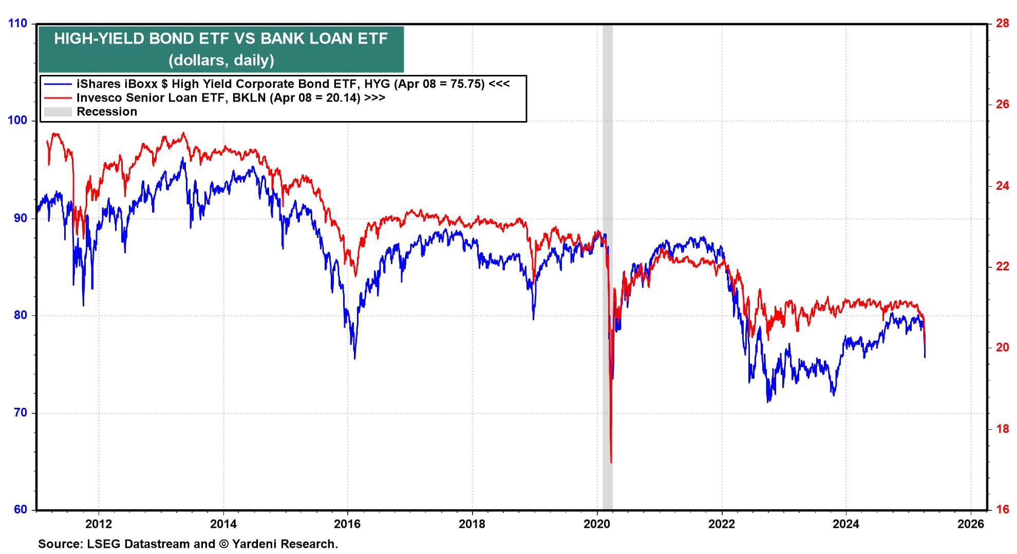 ETFs that invest in high-yield corporate bonds and in senior bank loans are starting to plunge (chart).