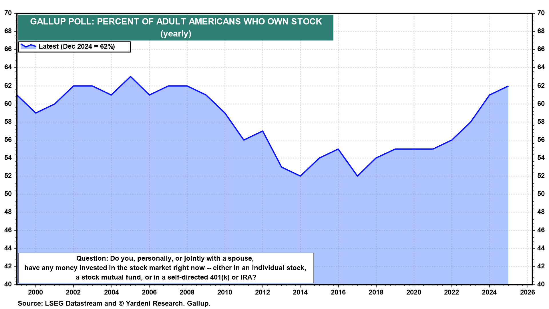 Trump administration officials have claimed that the plunge in stock prices caused by their tariffs only really hurts the wealthy. That's not true given that 62% of Americans have money invested in the stock market (chart). At the barber shop I went to on Sunday, everyone was complaining about how much money they lost recently in the stock market, including the barber. The guy who turned on my sprinkler system this afternoon was following the market on his cell phone and getting upset that the morning's rally fizzled.