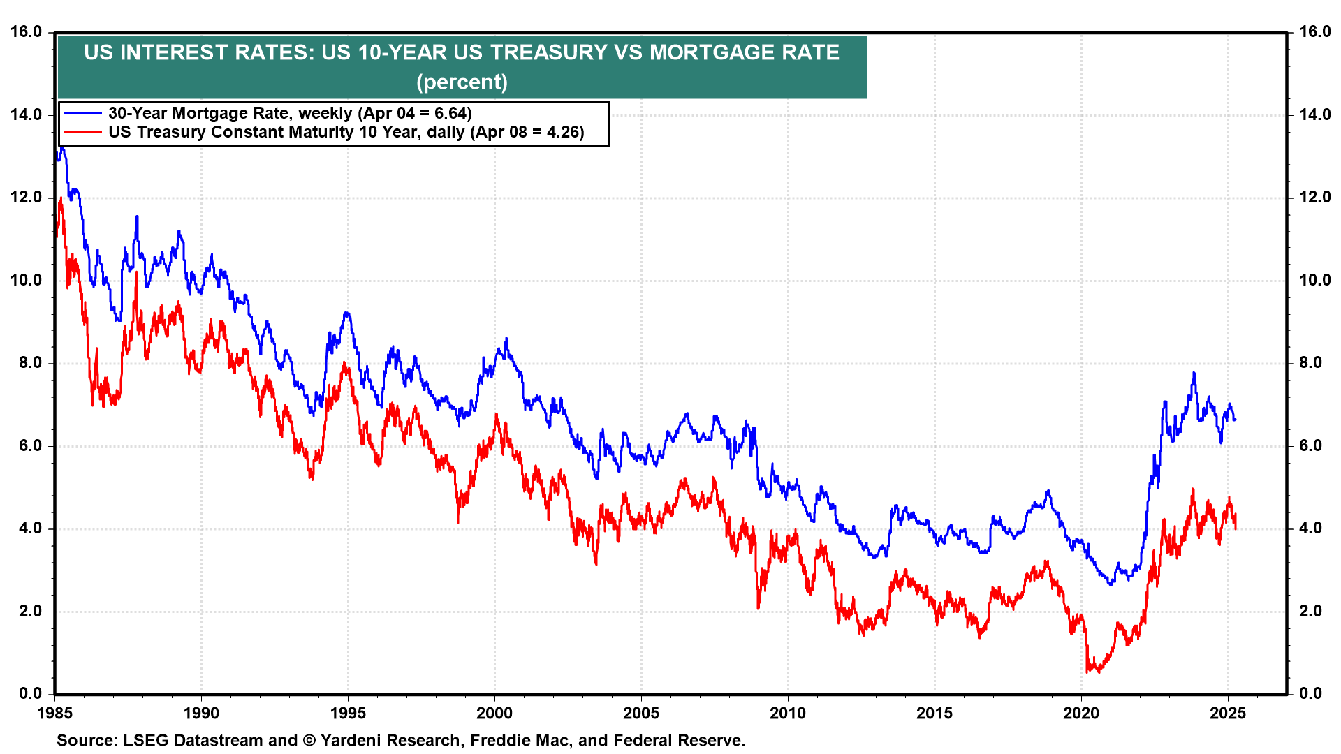 Trump administration officials have been taking credit for the recent drop in bond yields and mortgage interest rates (chart). Unfortunately, the 10-year Treasury bond yield is up from a recent low of 3.87% on April 4 (two days after Liberation Day) to 4.36% this evening! Mortgage rates hit their highest level in over a month this week, reversing course after a period of improvement.