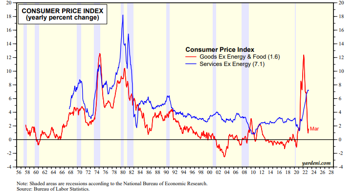 Could it be that the spike in inflation over the past two years was one of the many shockwaves caused by the pandemic? Is inflation turning out to be relatively transitory after all? Goods inflation is certainly looking transitory (chart). Services inflation has been much more persistent, but is likely to moderate during the second half of this year along with rent inflation. Wage inflation may remain troublesome, but less so if productivity makes a comeback from the adverse impact of the pandemic on the labor market.