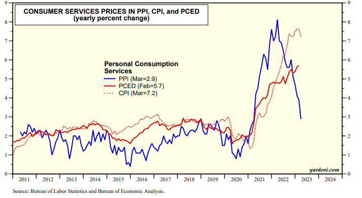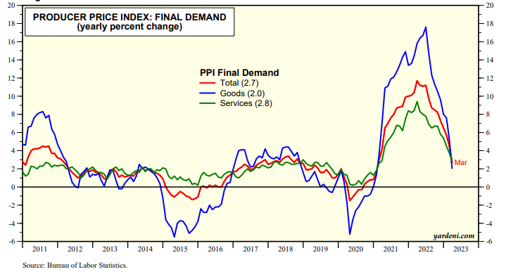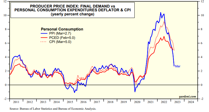This morning's release of March PPI data continues to support our disinflationary outlook for the rest of this year into 2024. The PPI for final demand fell to only 2.7% y/y, down from a peak of about 11.0% early last year (chart). PPI goods inflation has dropped from over 17.0% to 2.0% over this period. PPI services inflation (which does not include rent) fell from about 9.0% to 2.8% since early this year.