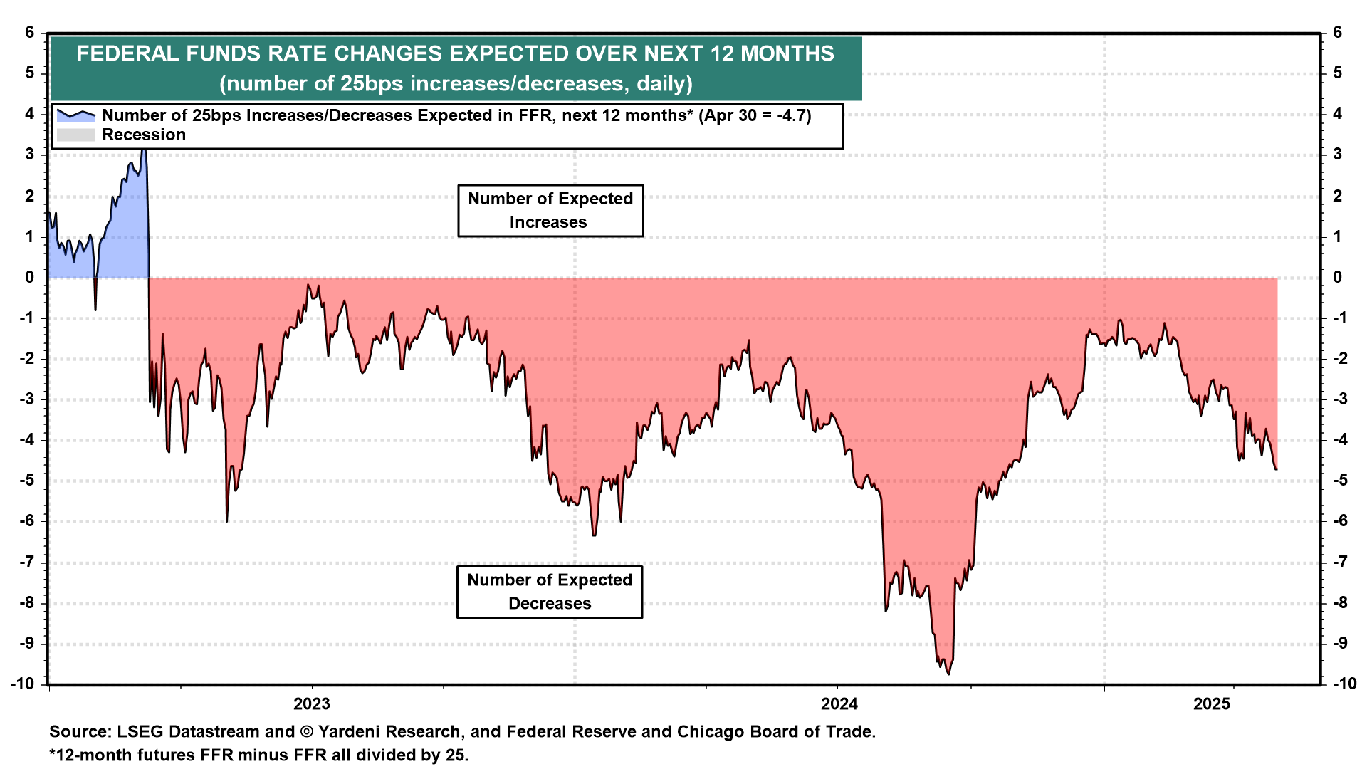 (4) The Fed. Following the latest batch of economic indicators, the federal funds rate (FFR) futures now show that the market expects four to five 25bps cuts in the FFR over the next 12 months. That helps to explain why the stock market has held up well in the face of the latest batch of relatively weak economic indicators. The bond market seems to be less convinced about Fed rate cuts.