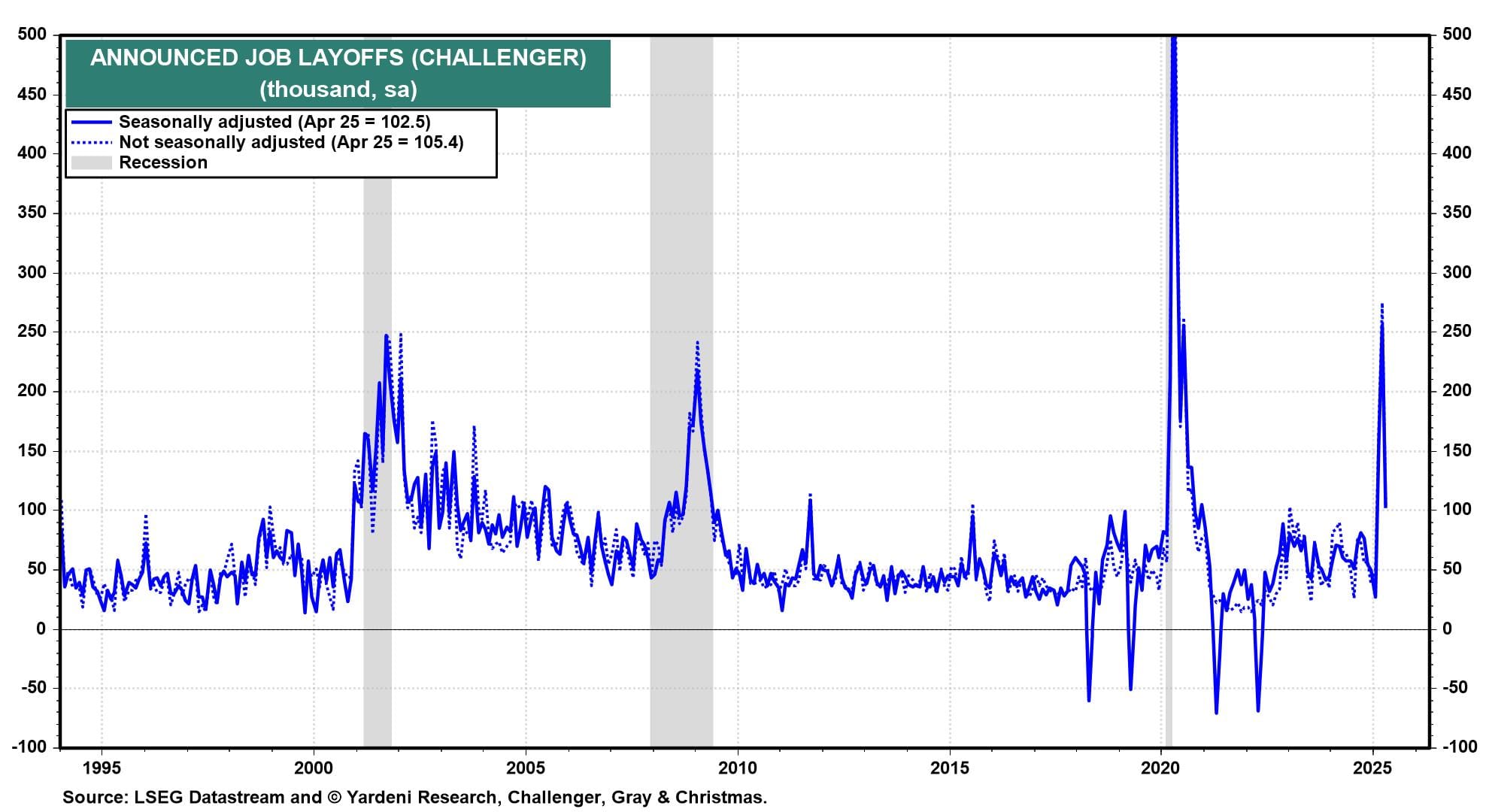 Global outplacement firm Challenger, Gray & Christmas said on Thursday that planned job cuts fell 62% to 105,441 last month (chart). Layoffs were, however, 63% higher compared to last year and April's tally was the highest for the month in five years.