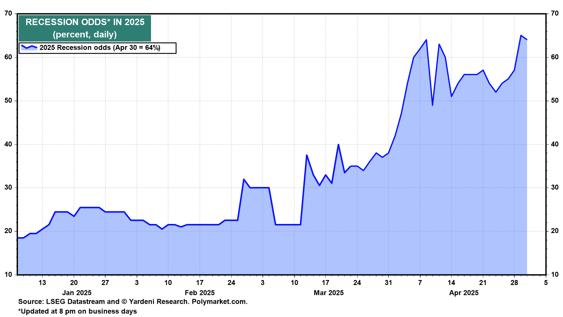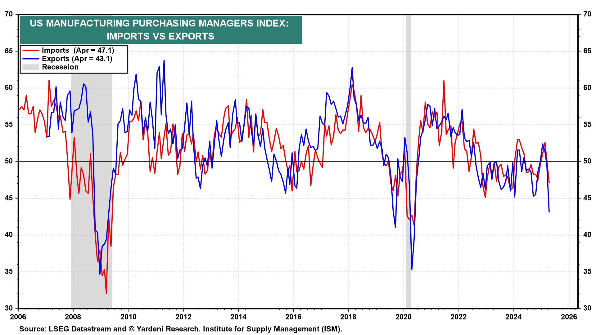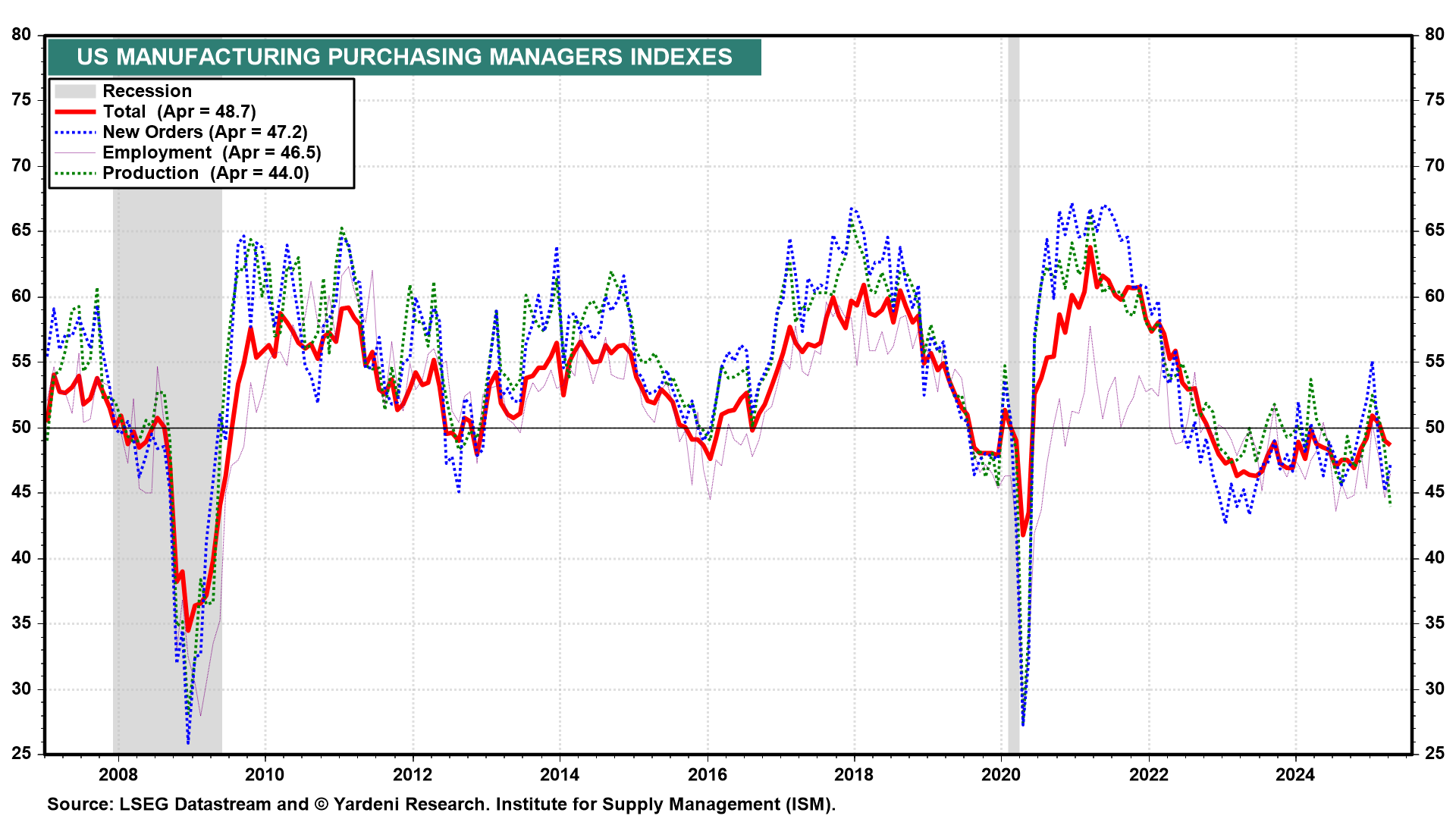 (2) Manufacturing. April's M-PMI edged down to 48.7 (chart). That's a second consecutive reading below 50.0. The production index was especially depressed at 44.0. The new orders and employment indexes were also below 50.0. The word "tariff" was mentioned 27 times in the report compiled by the Institute for Supply Management. Tariffs are putting upward pressure on the prices-paid index, which remained elevated at 69.8.
