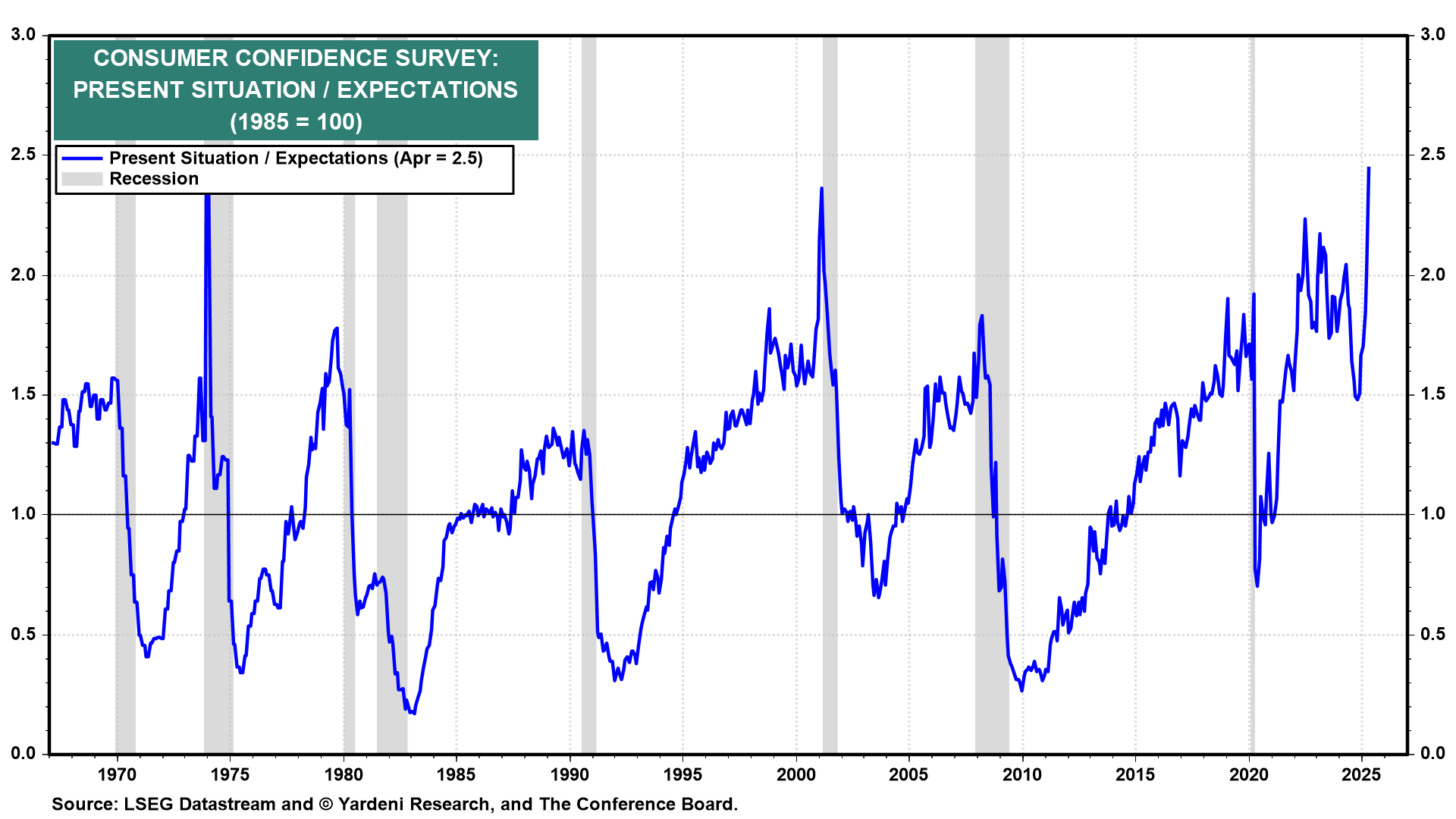 (1) Consumer confidence. On Tuesday, we learned that the Consumer Confidence Index (CCI) fell to a nearly five-year low in April, down 8 points to 86.0. It's the fifth straight monthly decline, the worst such stretch since 2008. The decline has been led by the CCI's expectations component. The present situation component is relatively upbeat. However, the ratio of the present to the expectations components soared in April as it did prior to past recessions (chart)