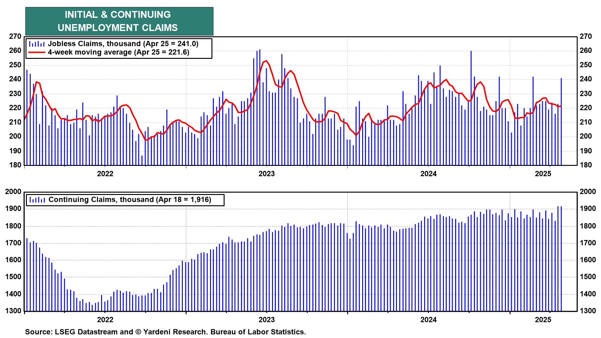 (3) Unemployment claims and layoffs. During the week of April 25, initial unemployment claims jumped by 18,000 to 241,000 (chart). New York accounted for 15,525 of the increase. Continuing claims remained relatively elevated for the second week in a row. However, none of these readings are proof-positive that a recession is imminent.