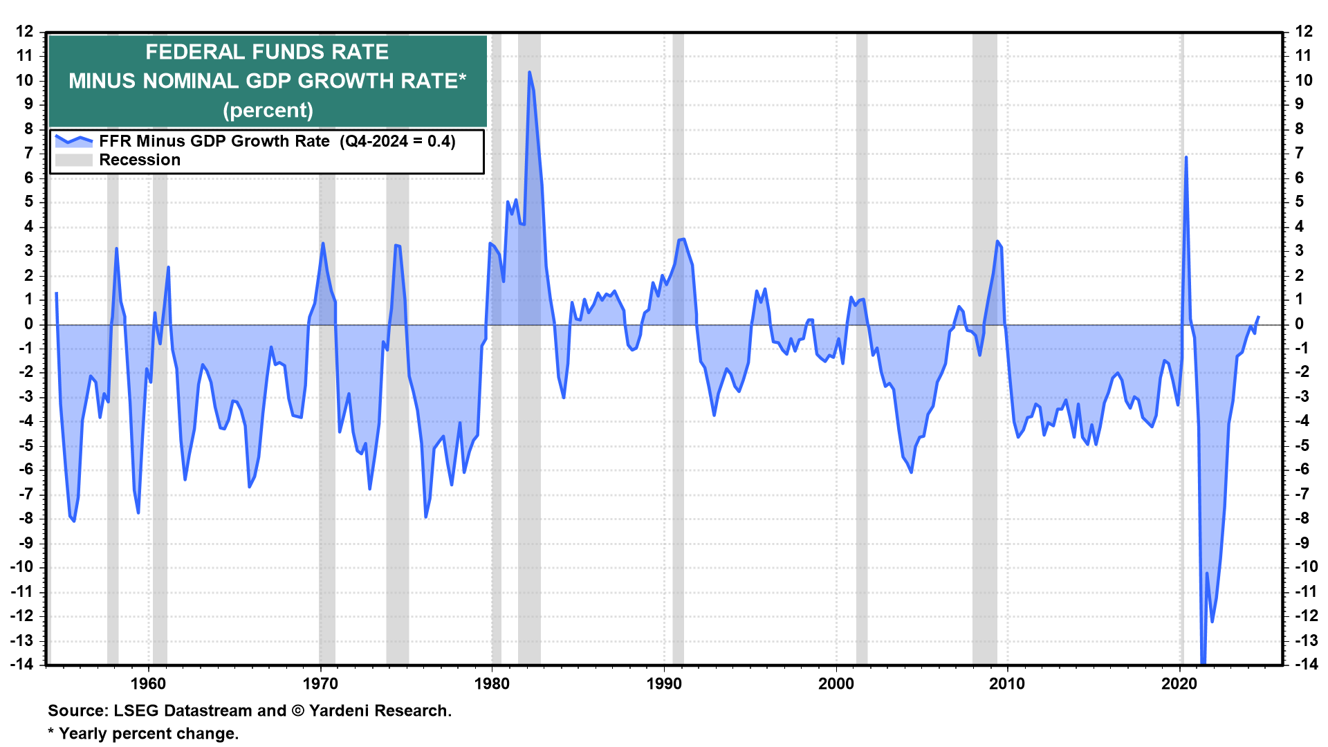 We agree with the dissenters. We devised a simple way to judge whether the Fed is restrictive or not. Recessions tend to coincide with periods when the FFR exceeds nominal GDP growth (chart). The spread is currently close to zero, suggesting that the FFR isn't too restrictive.