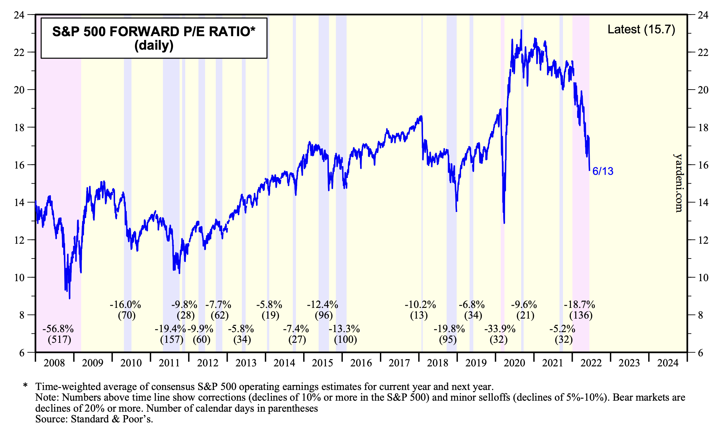 Over this period, the S&P 500 forward P/E plunged 26.6% from 21.4 to 15.7 even as forward earnings (i.e., the time-weighted average of analysts’ earnings estimates for 2022 and 2023) continued rising to new record highs. Investors lost confidence in those projections as they fretted that persistent inflation would force the Fed to raise interest rates to levels that might cause a recession, which would depress earnings. Persistent inflation meant that the Fed Put was kaput, and there is no upside in fighting the Fed when it is fighting inflation.