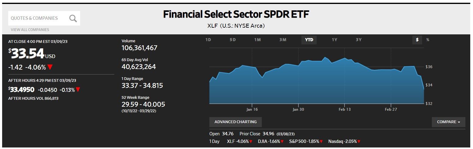 The stock prices of both the money center banks and the regional banks were hard hit today. The Financial Select Sector SPDR ETF (XLF) fell 4.1% (chart).