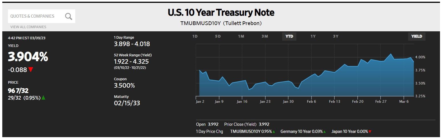 Rising interest rates have boosted the banks' interest margin. But they also increase the risks that something will break in the financial system. That is why the 10-year Treasury bond yield fell to 3.91% from a recent high of 4.06% on March 2 (chart).