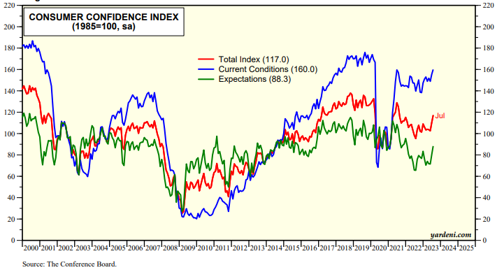Among the earliest monthly indicators of the US jobs market is the consumer confidence survey conducted by the Conference Board. July’s survey came out on Tuesday. The Consumer Confidence Index rose smartly this month, with solid gains in both its current conditions and expectations components (chart).